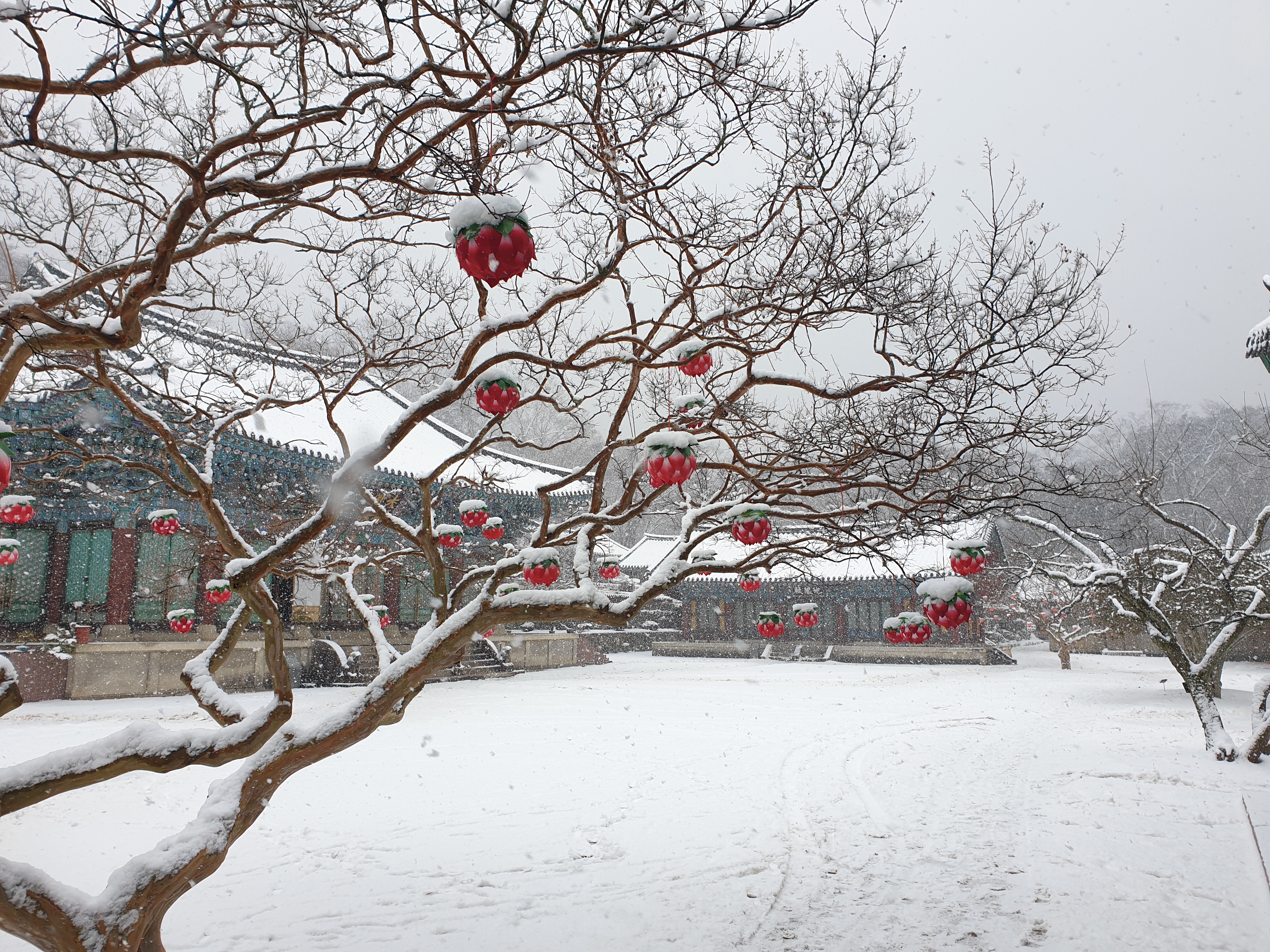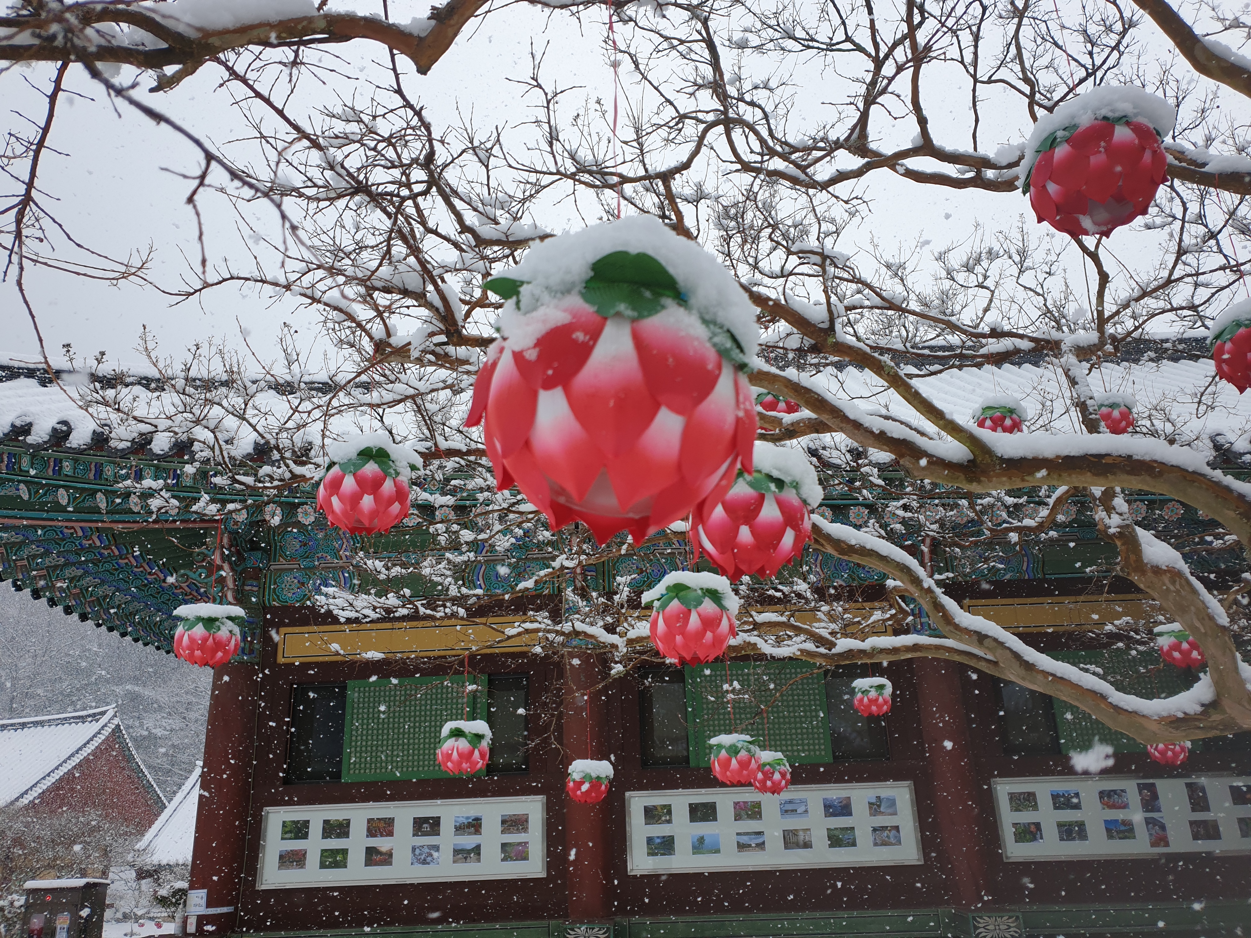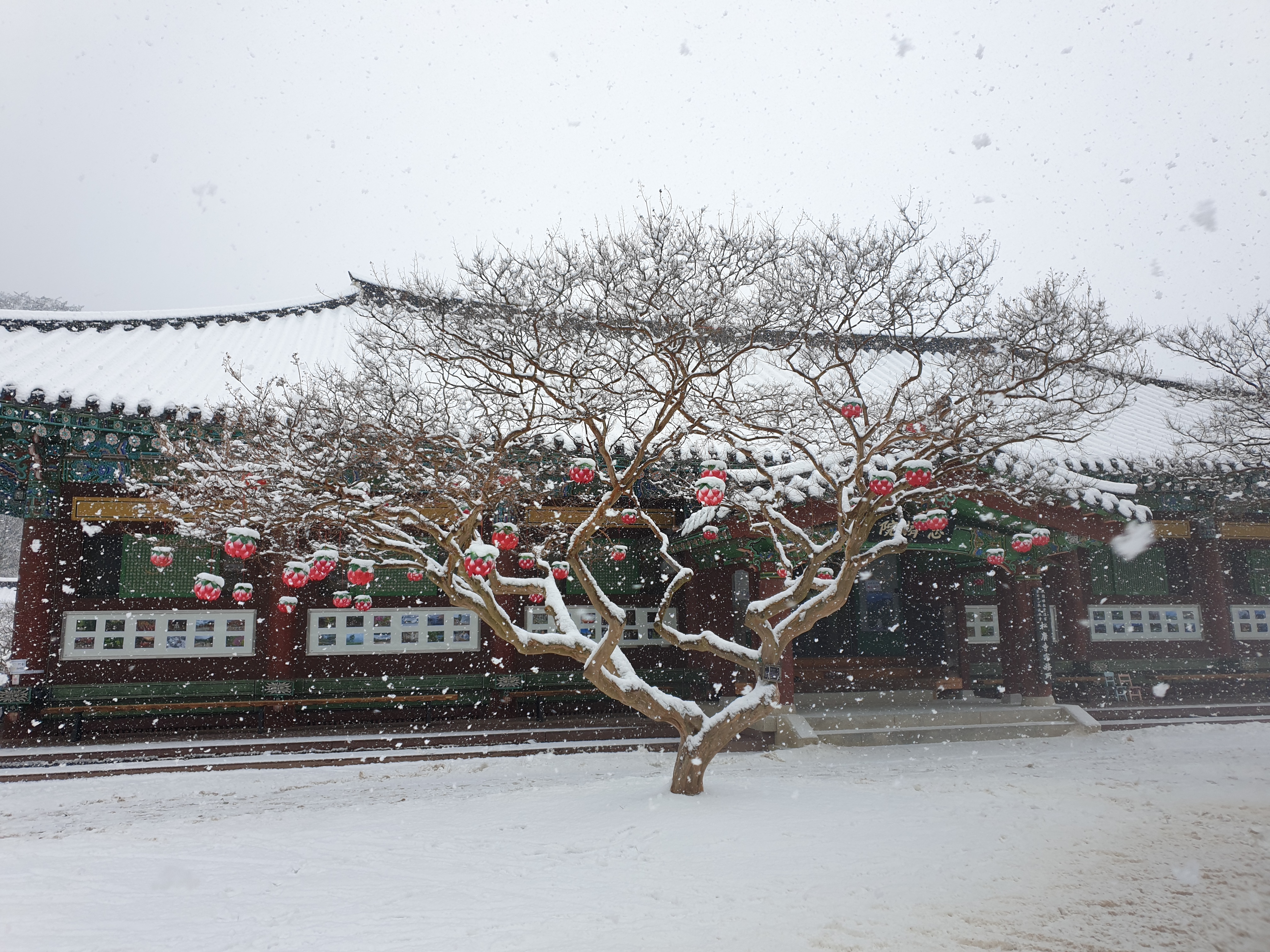 송광사에 눈이 내리던 날 배롱나무의 연등