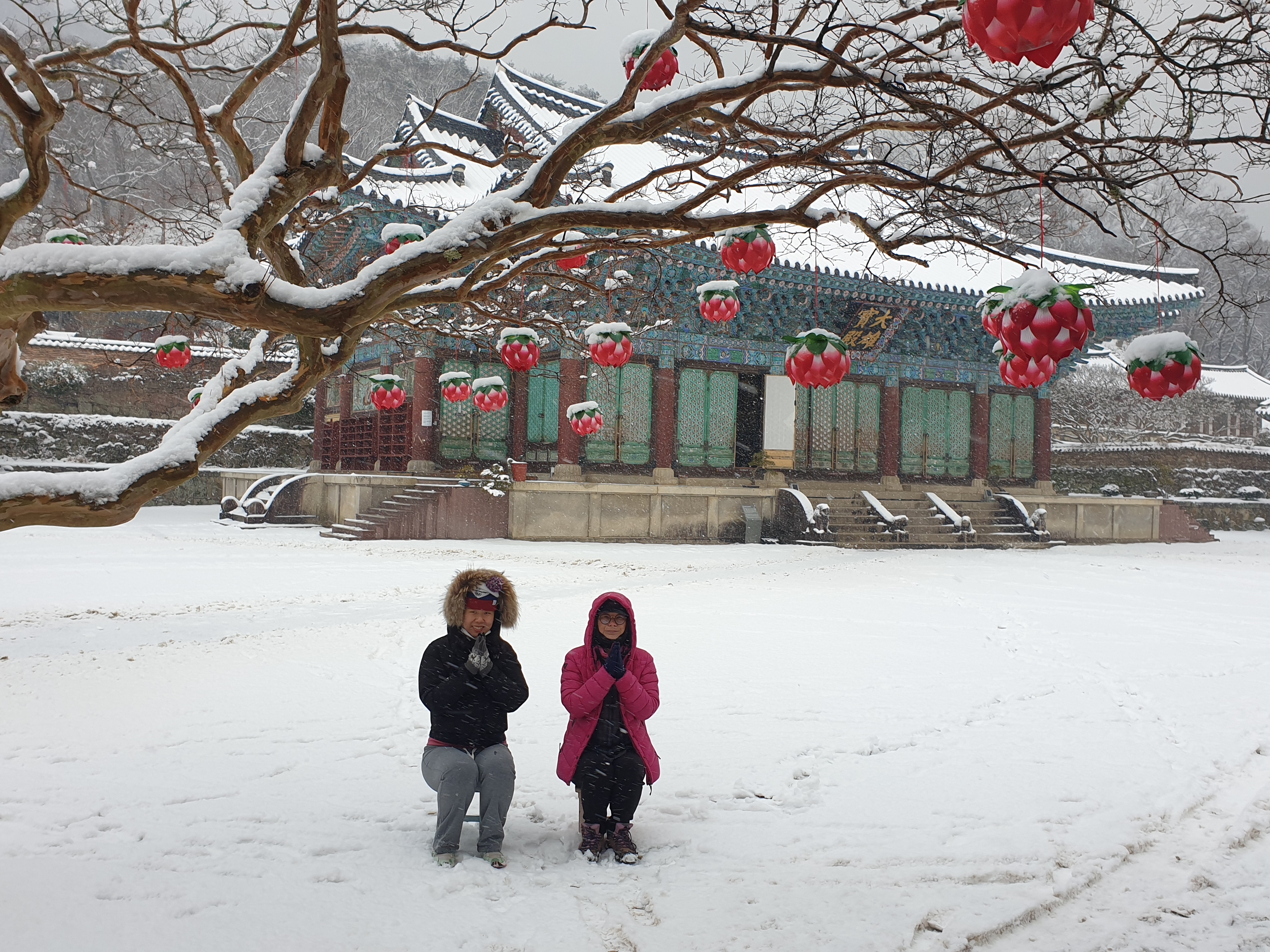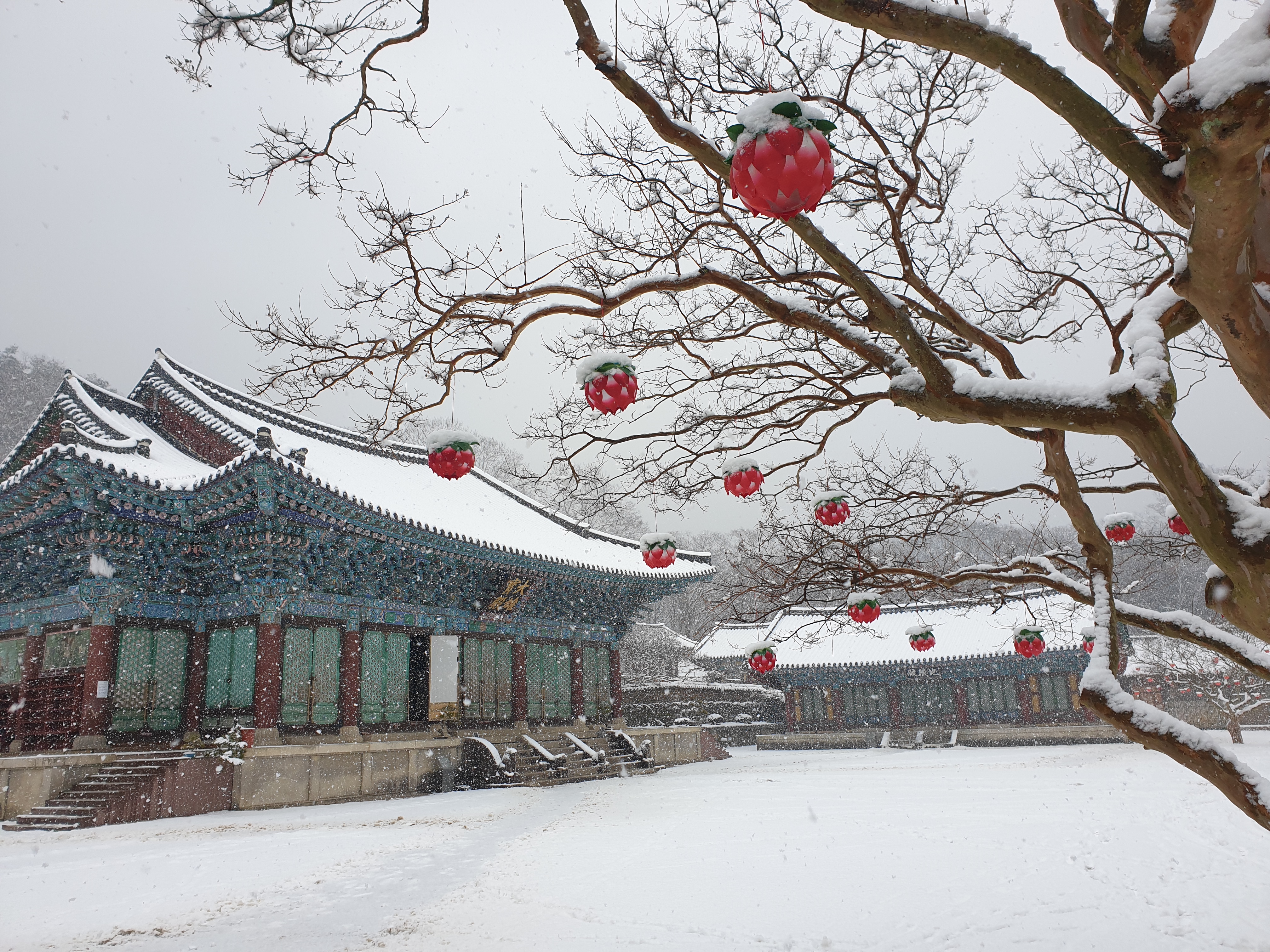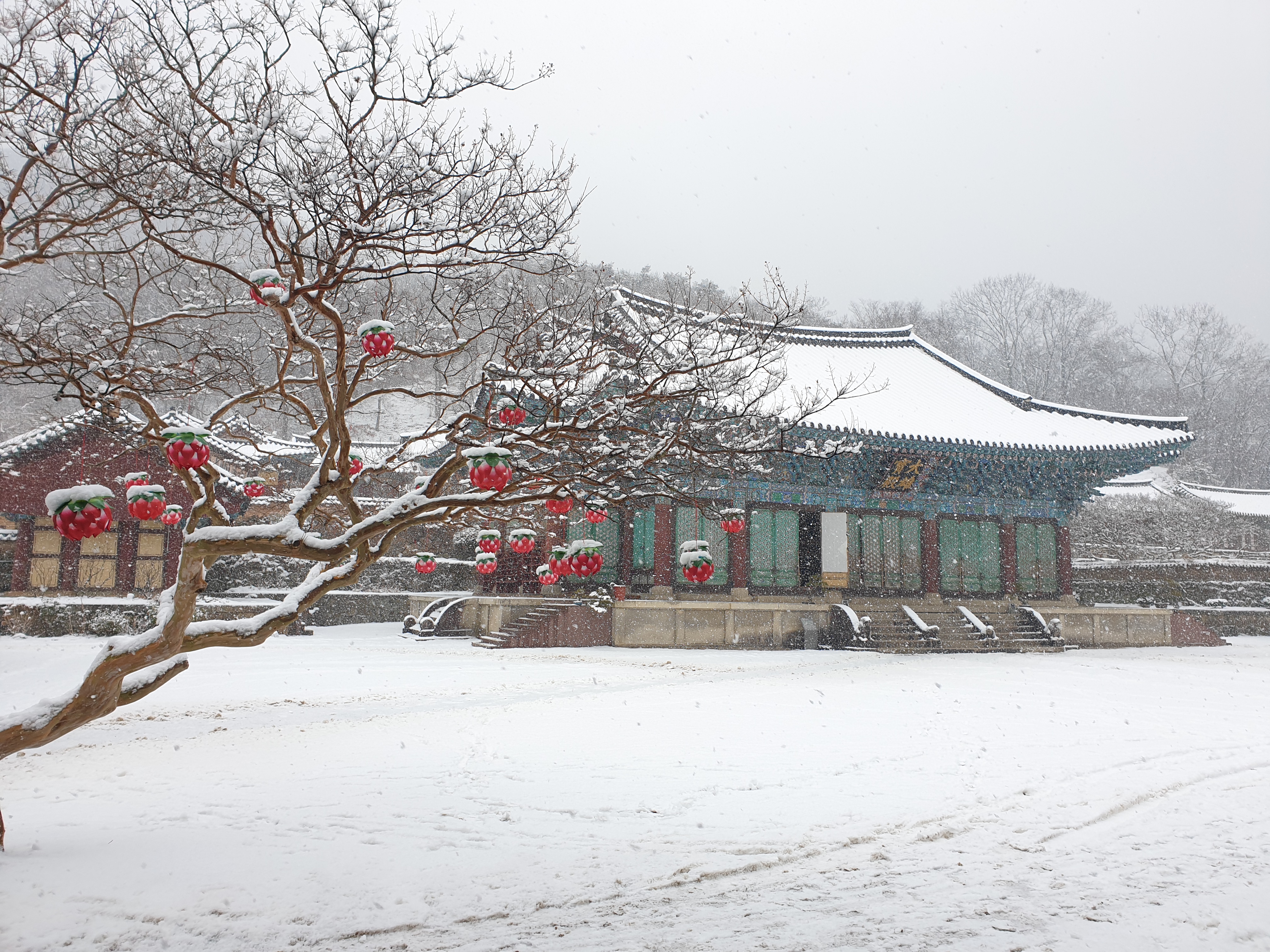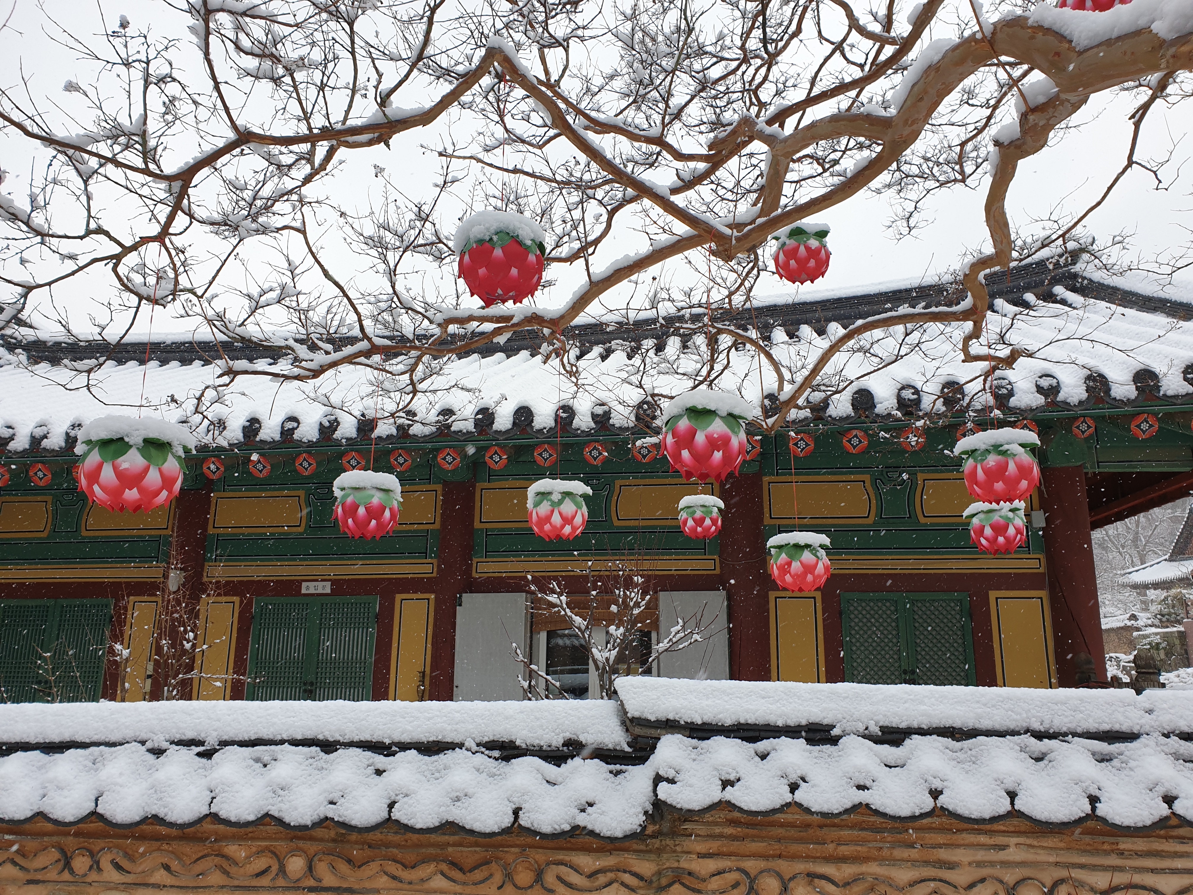 송광사에 눈이 내리던 날 배롱나무의 연등