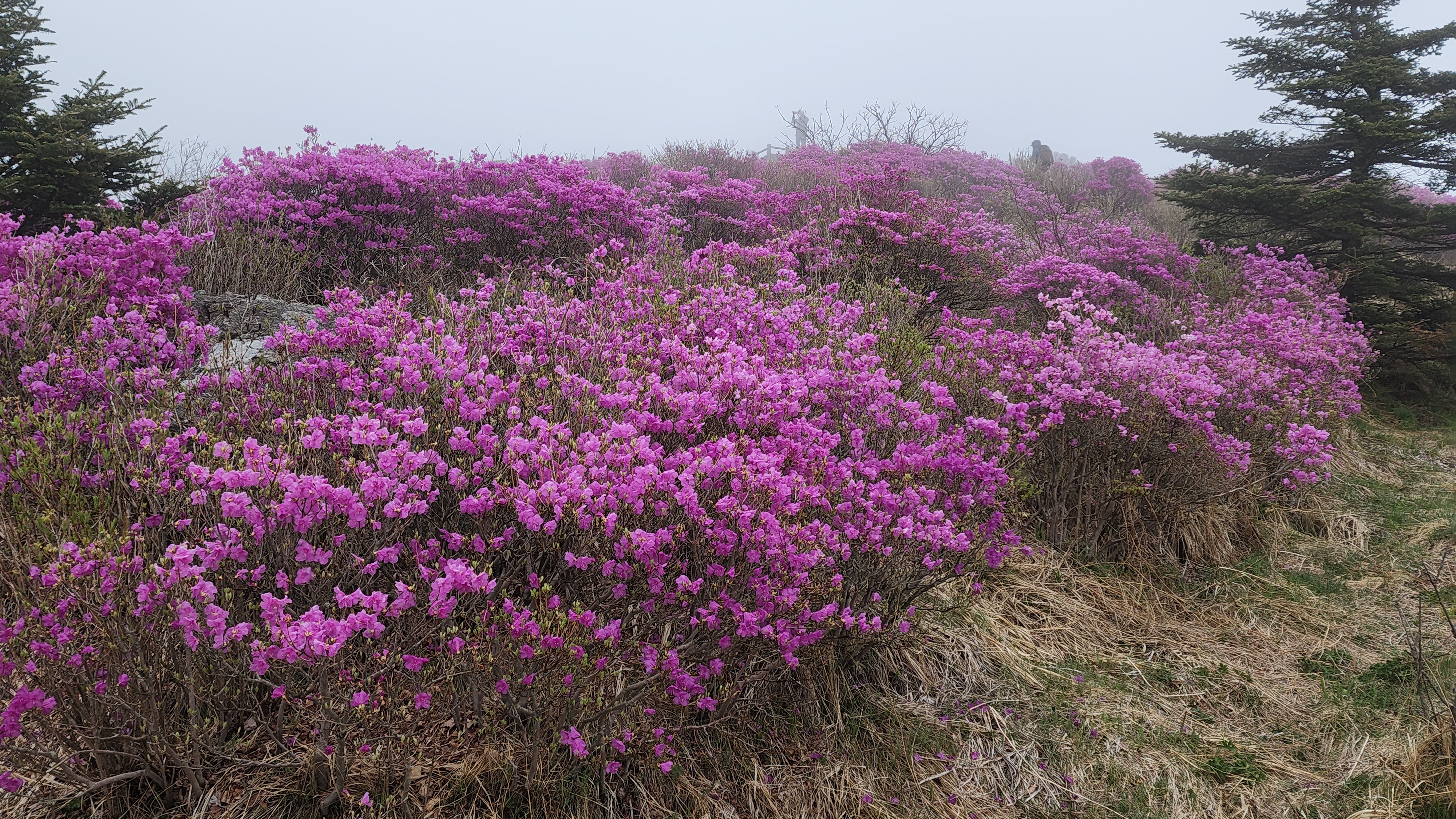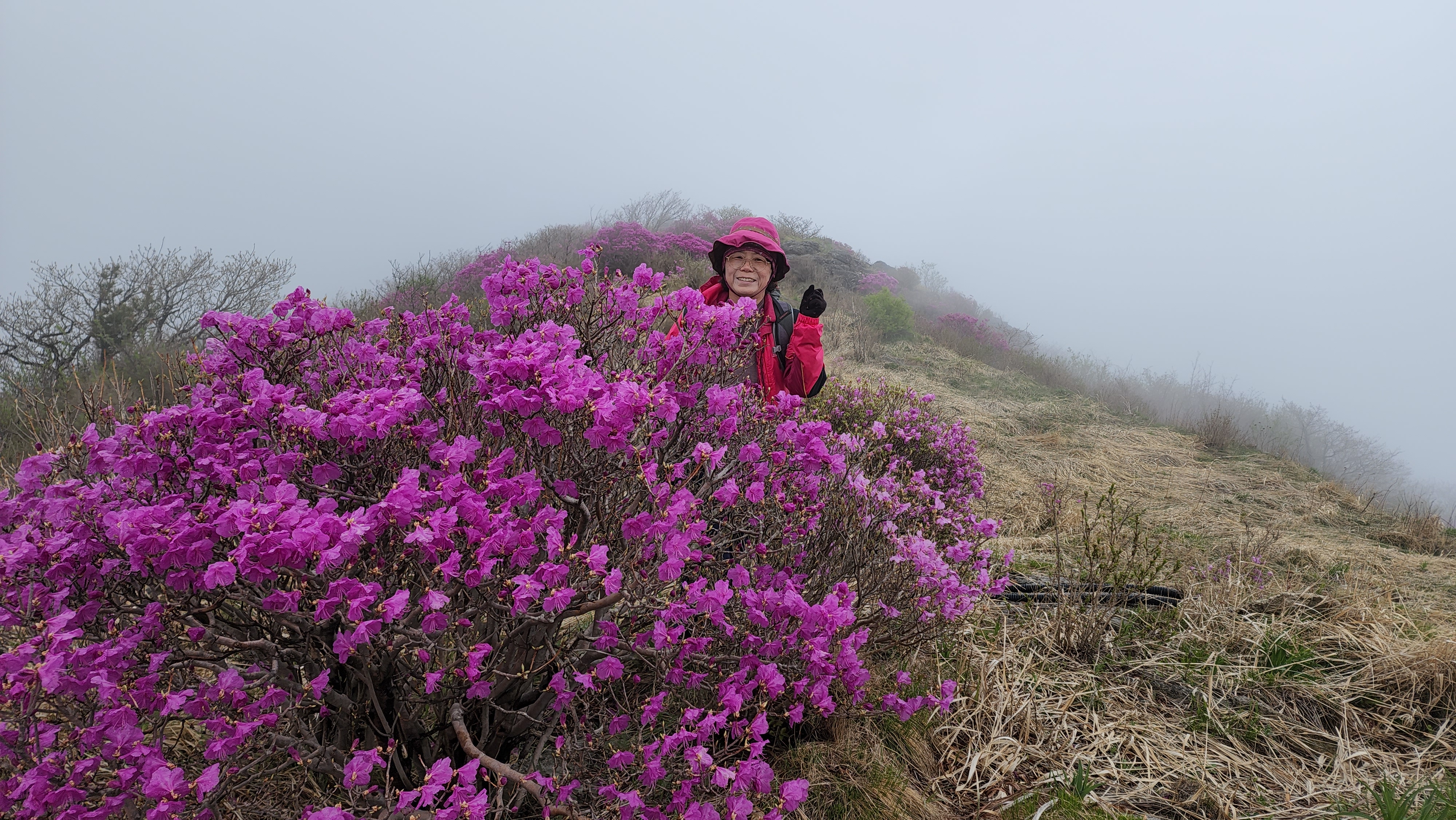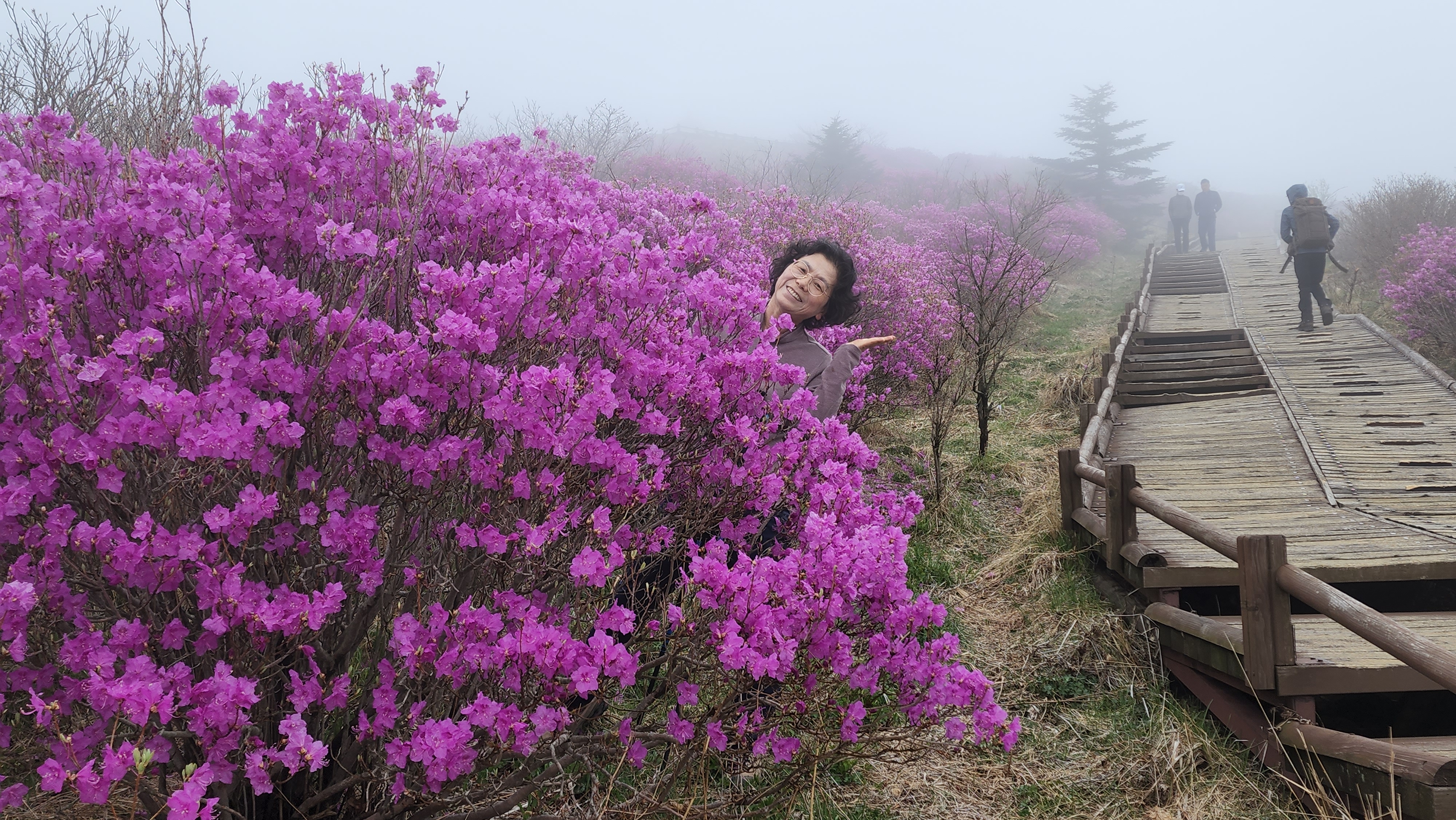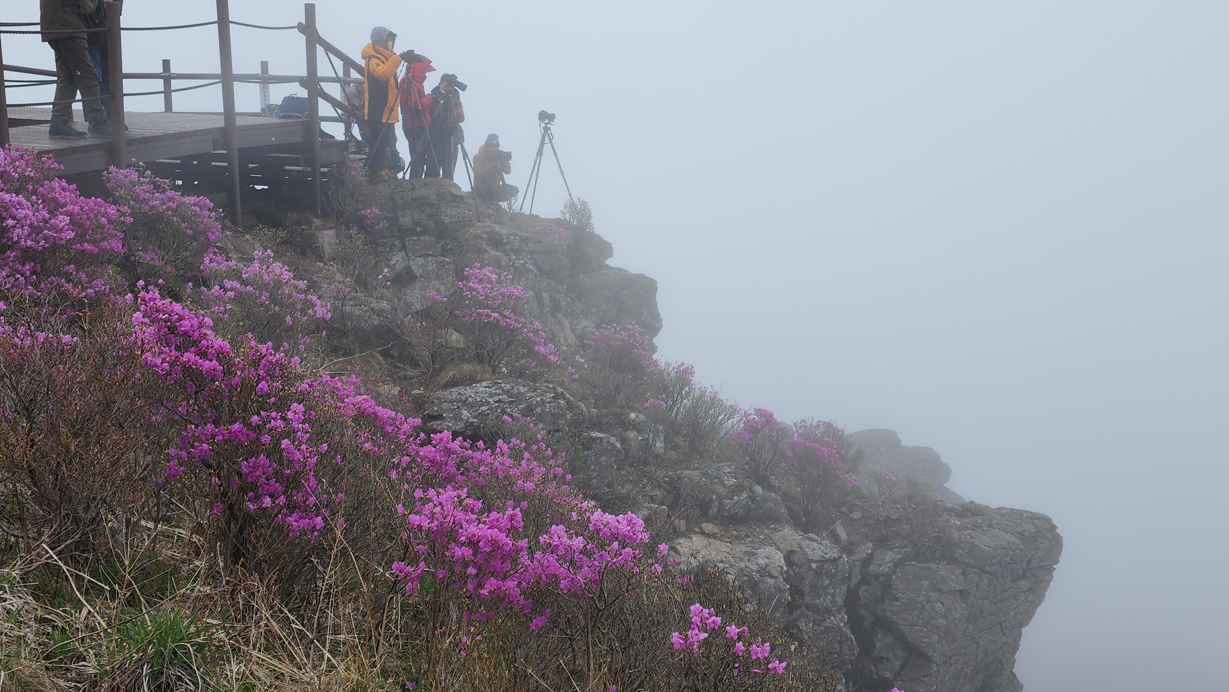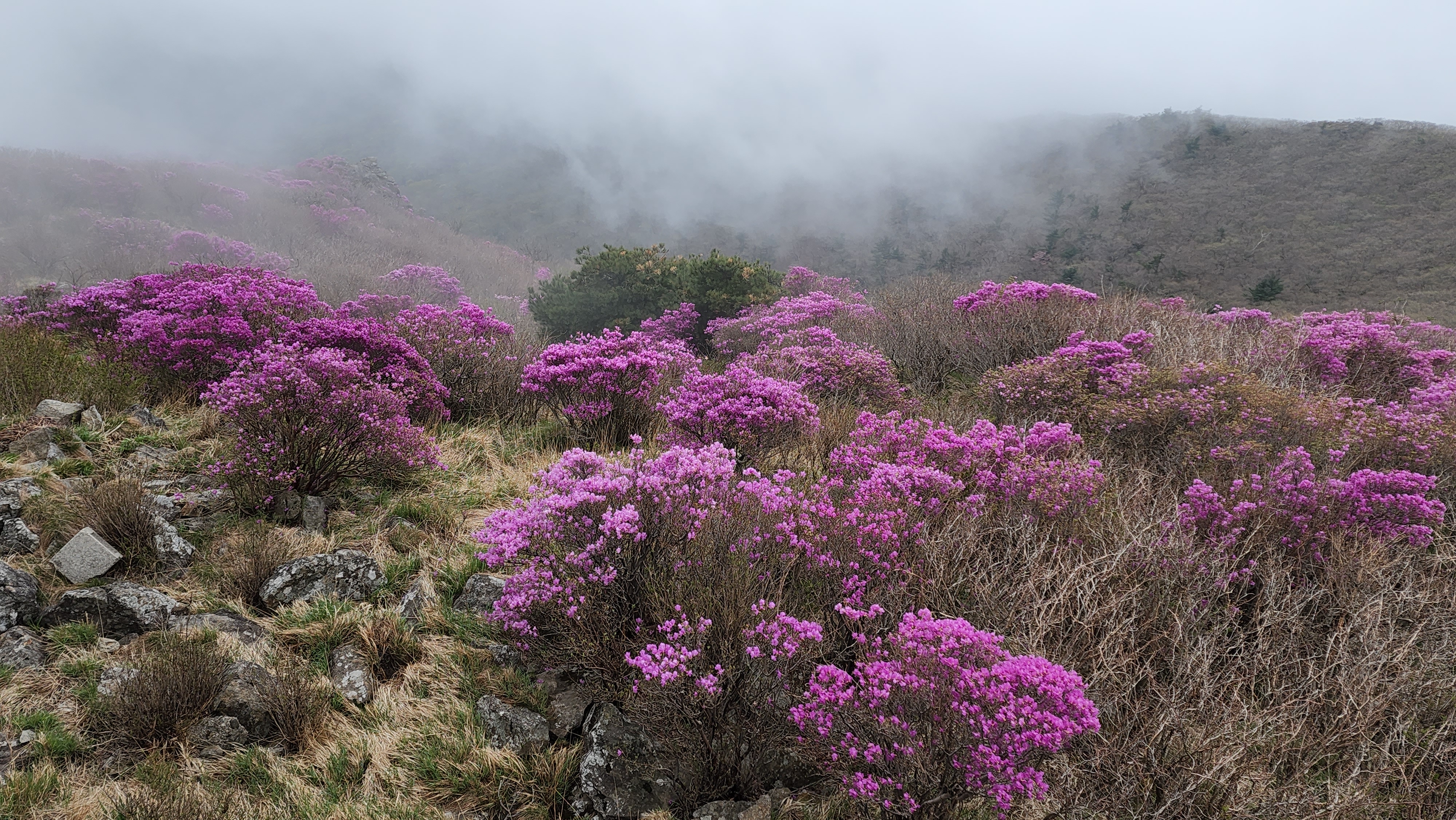 안개가 자욱한 노고단의 진달래