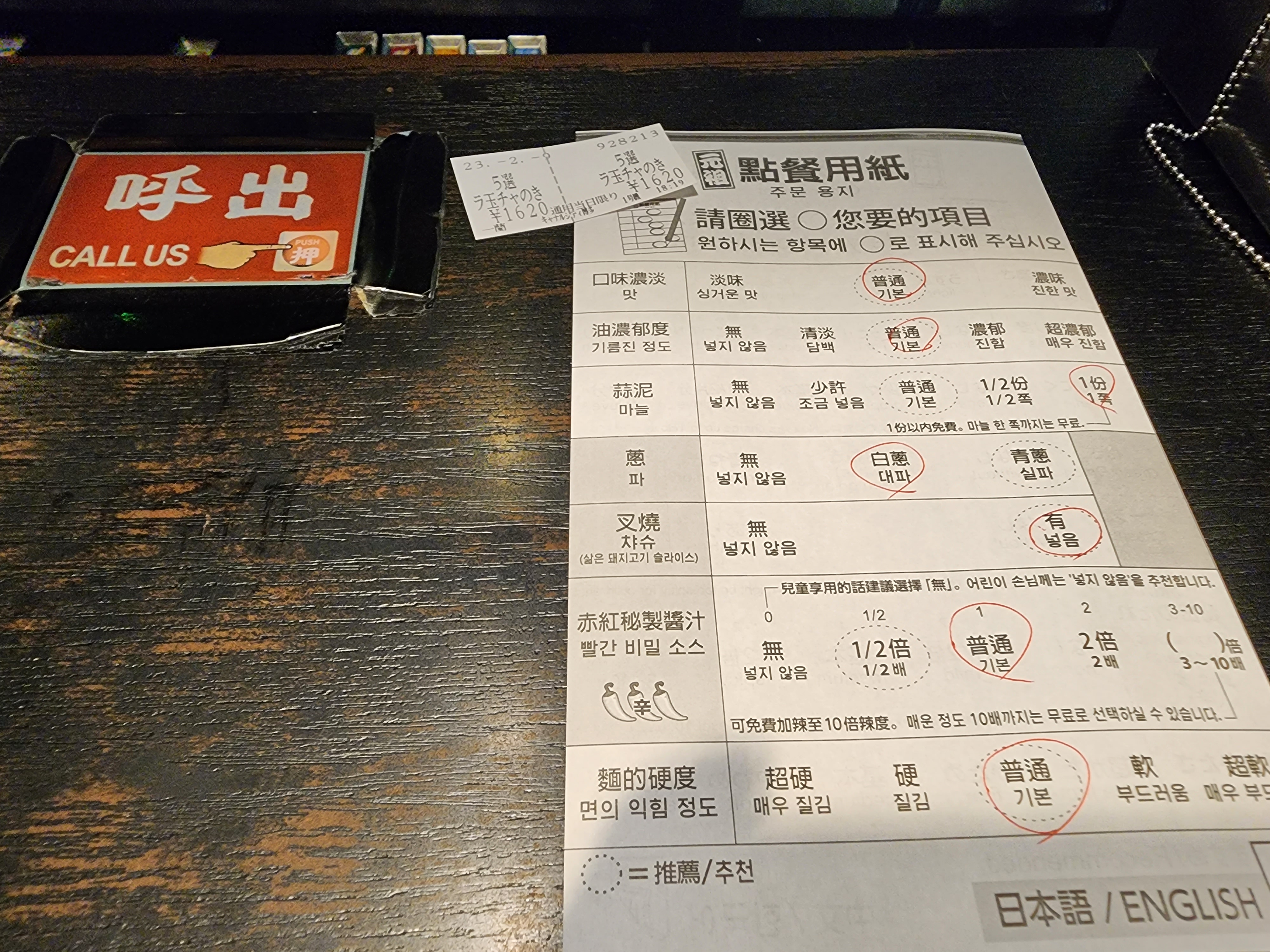 이치란주문표