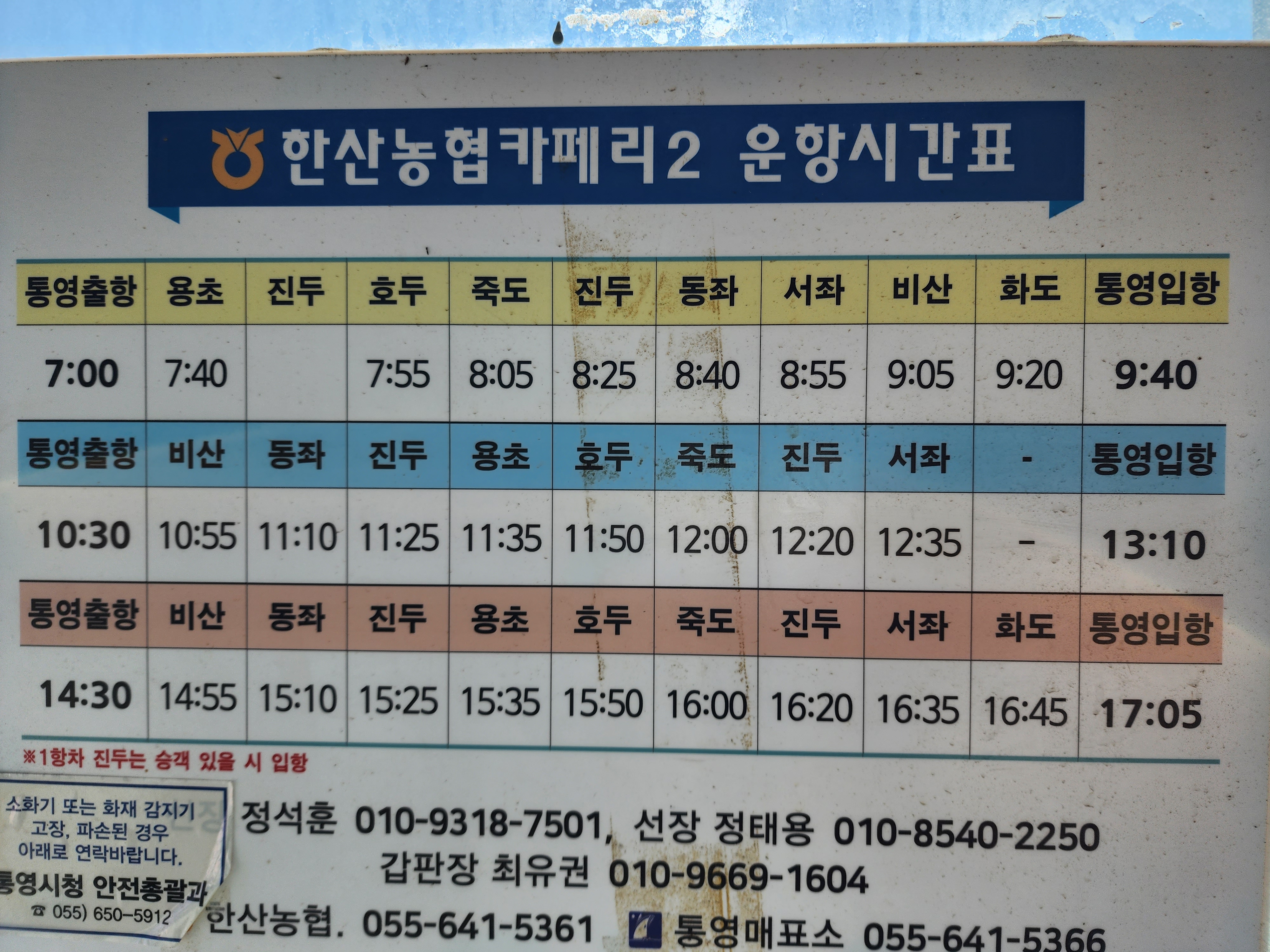 하루에 3번 운행되는 용초도배시간표 통영항7시 용초7:40 호두11:50 진두12:20에 도착하여 한산도망산등산