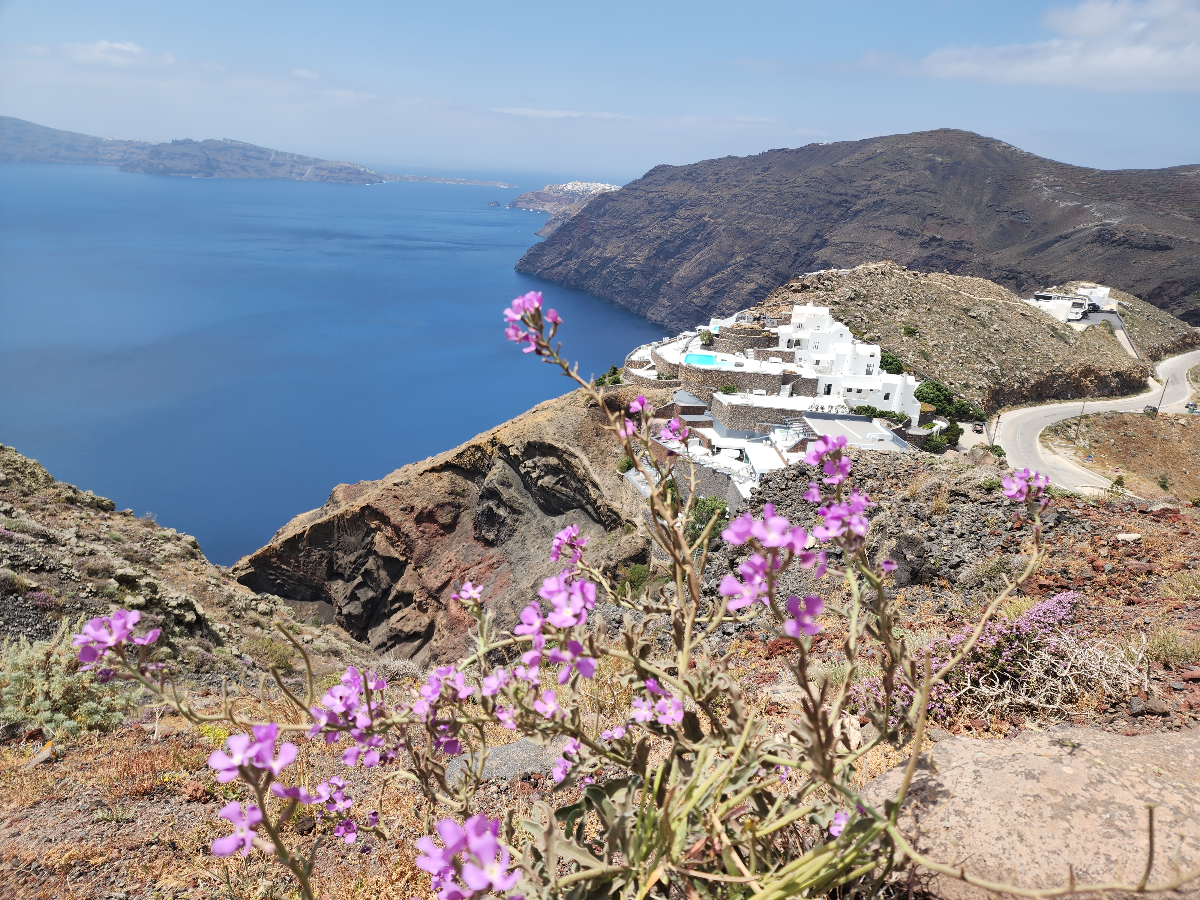 산토리니 여행 3일째 이아마을에서 피라마을 까지 트레킹하면서 본 풍경. 트레킹 길은 약간의 오르막 내리막이 있으나 걷기 좋은 길이었다. 눈 밑으로 펼쳐지는 지중해의 푸른 바다와 독특한 화산 지형과 다양한 야생화 등 불어오는 바람과 함께 걷기의 즐거움을 만끽할 수 있다. 걷기를 좋아하는 사람이면 걸어볼 만하다.