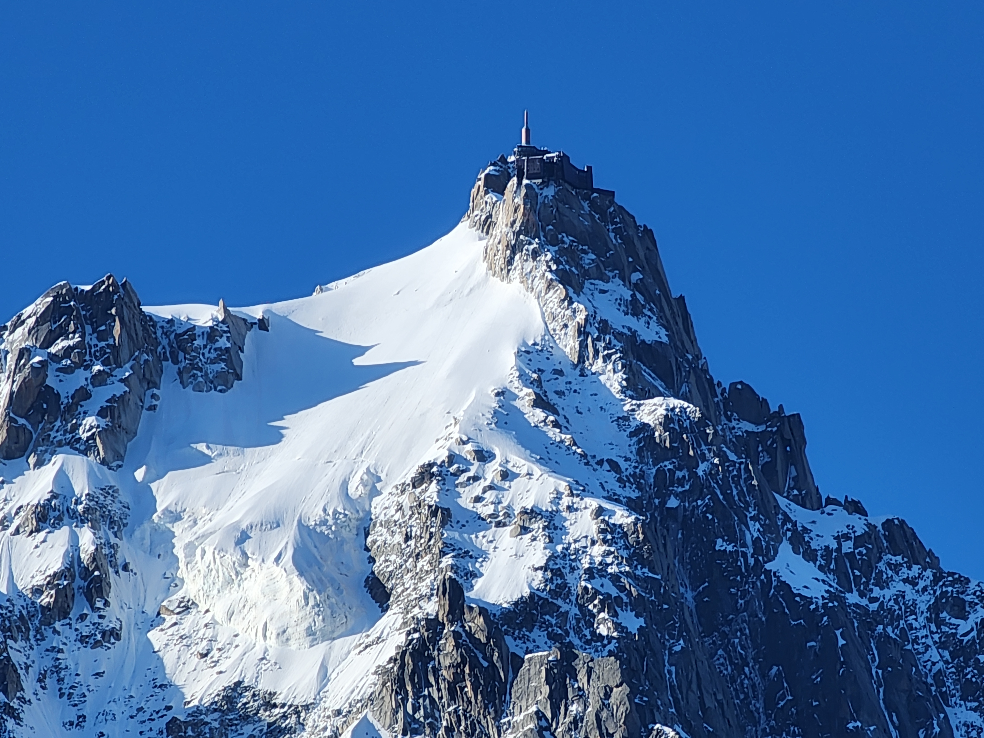 샤모니를 떠나 돌로미티로 가는 화창한 아침 날씨 표정. 에뀌띠미디 전망대가 잘 보인다. 그렇게 구름에 가려져 있더니만, 떠나려니 날씨가 좋네.