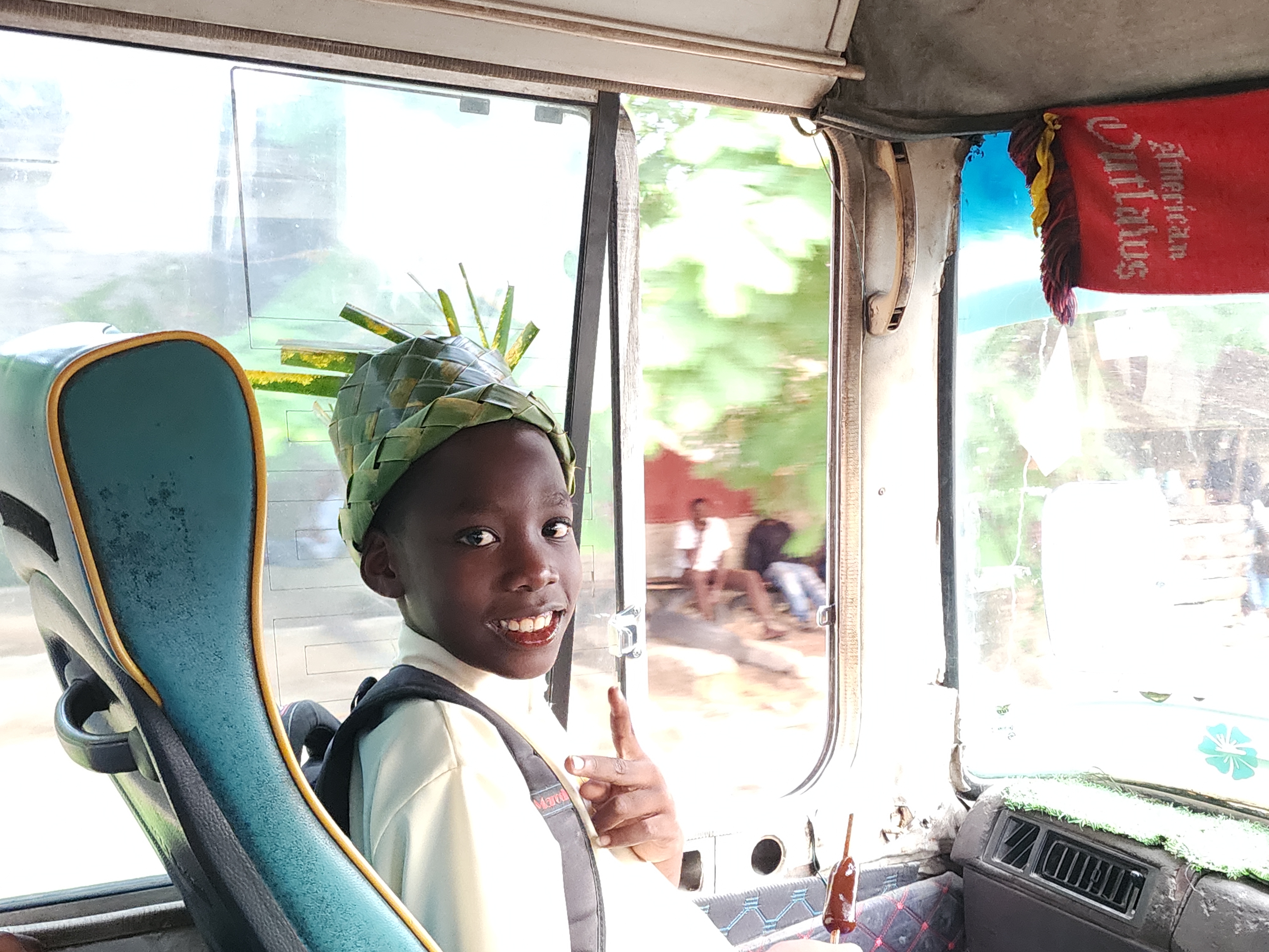버스에 탄 현지 학생에게 모자를 줬더니 좋아하면서 포즈를 취해준다.