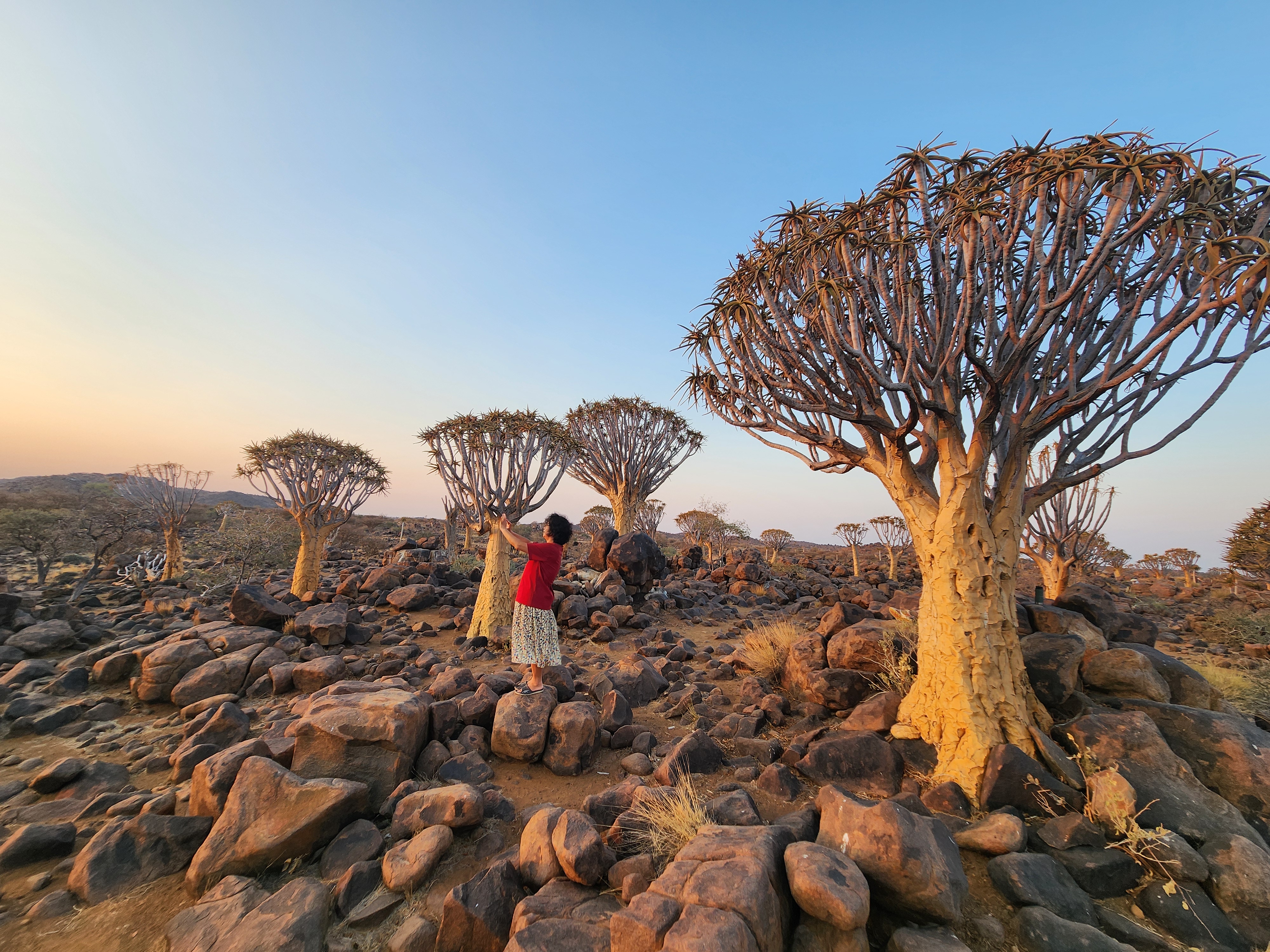 피시캐년에서 점심을 먹고 다시 달려 자동차가 많이 전시되어 있는 휴게소에 들러고 또 사막을 달리고 달려 오늘 숙소에 도착하여 텐트 치고 쉬다가 일몰 시간에 맞추어 퀴어트리숲 일몰을 보러 갔다. 숙소에서 20분 정도 달려 가니 퀴어트리숲이 나왔다. 가는 길에 치타도 보고 퀴어트리숲 일몰은 말 그대로 장관이었다.