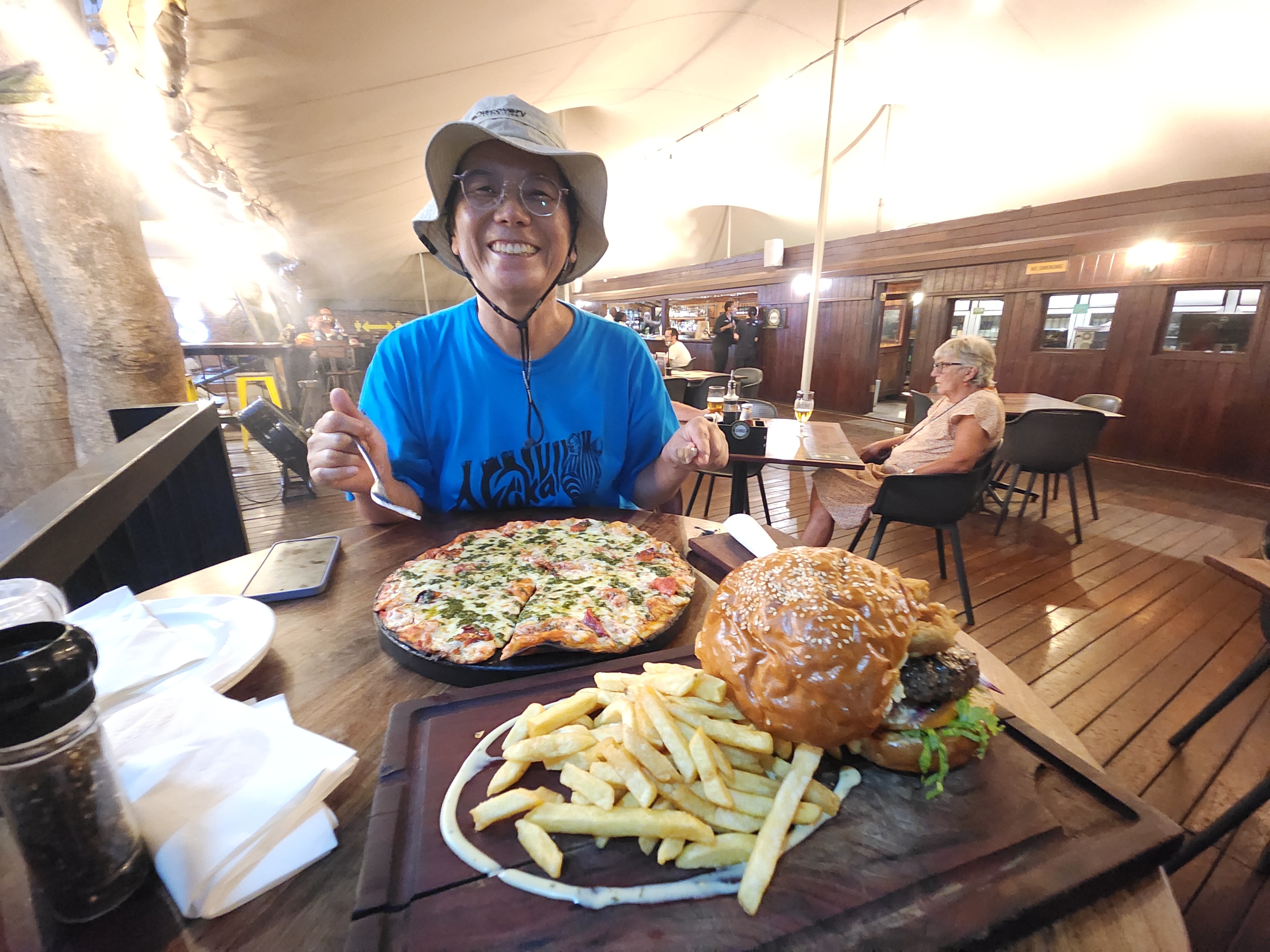 Three Monkeys 레스토랑의 힘버거는 맛이 좋았으나 피자는 짜다.