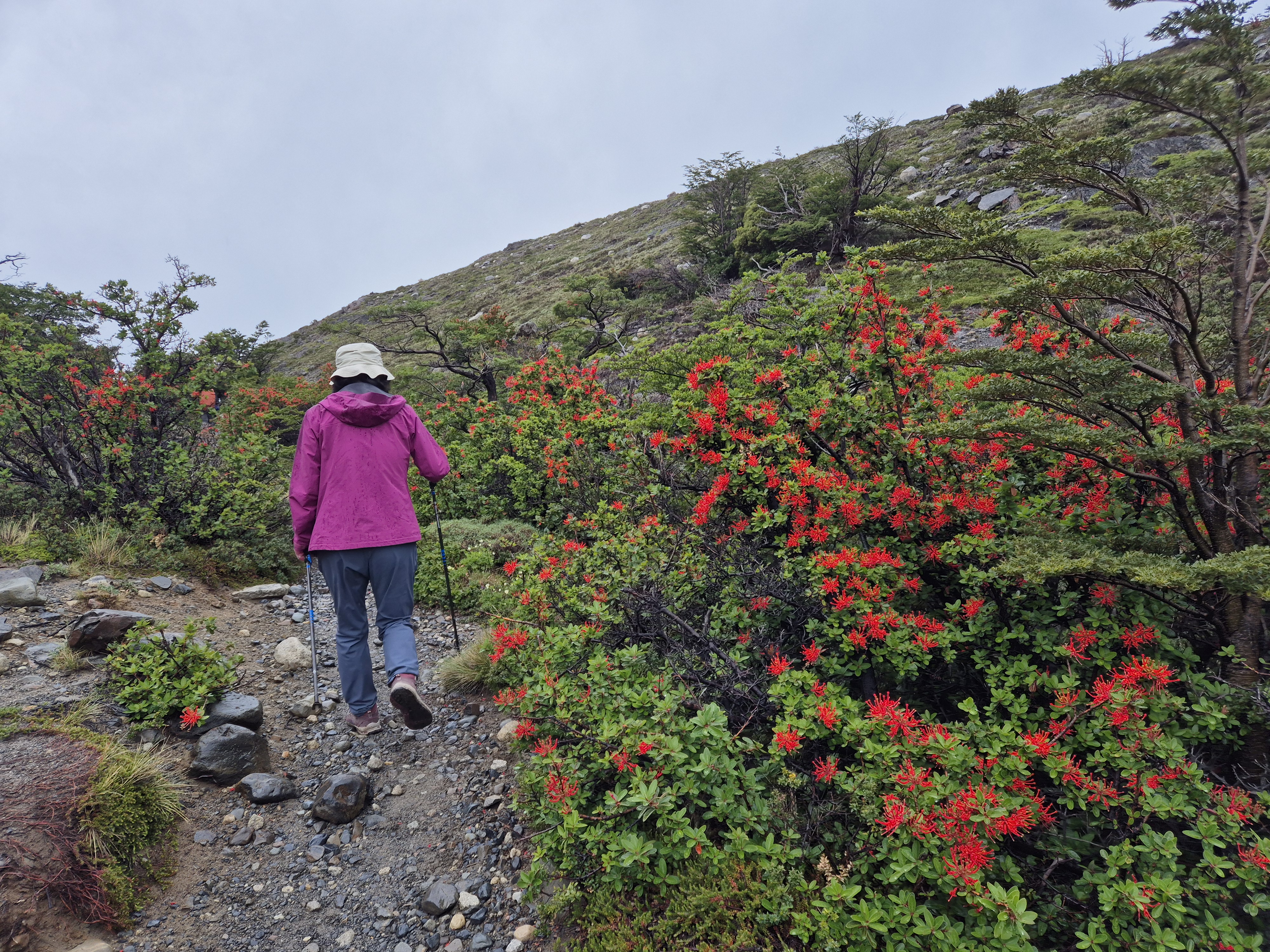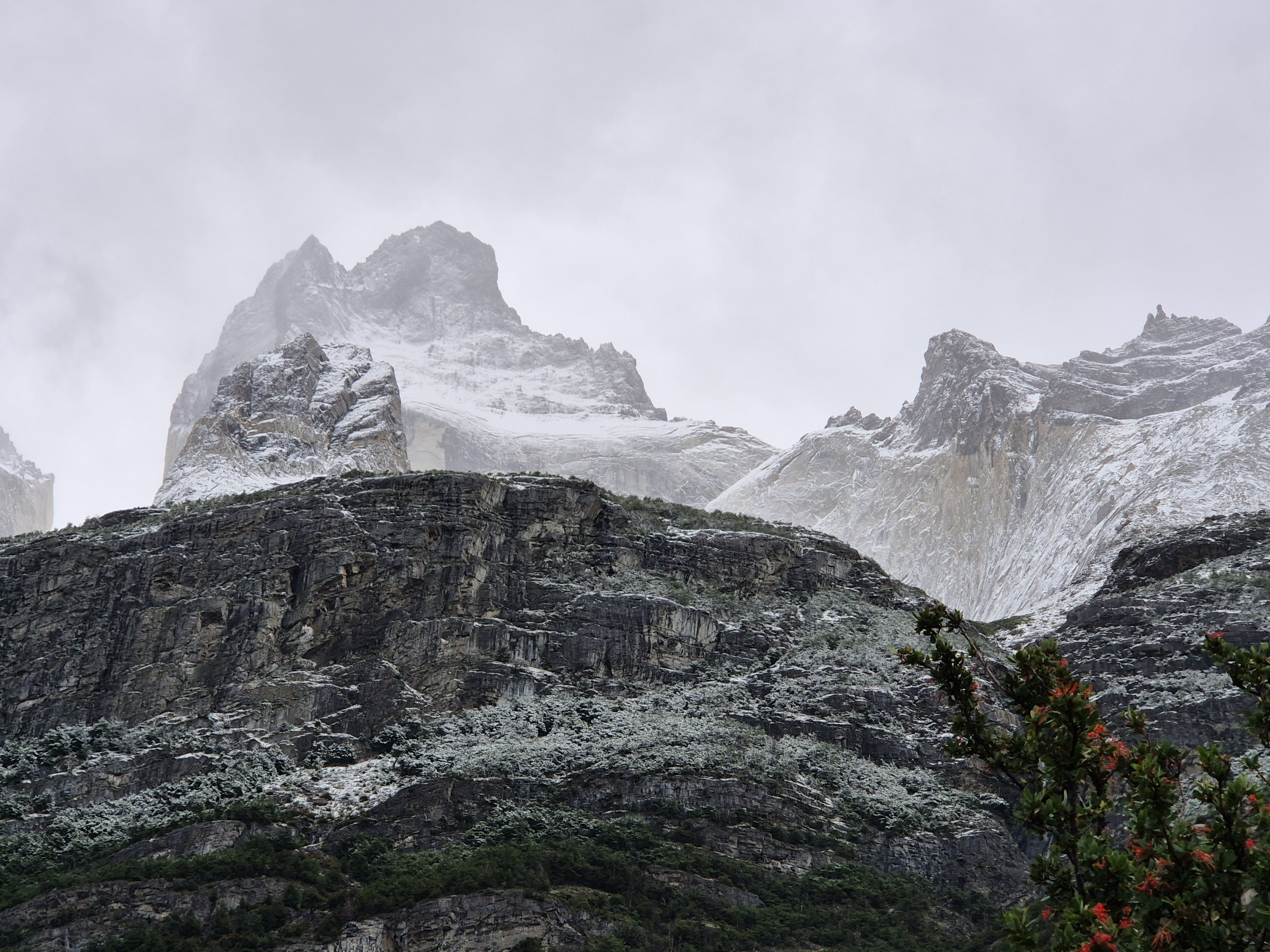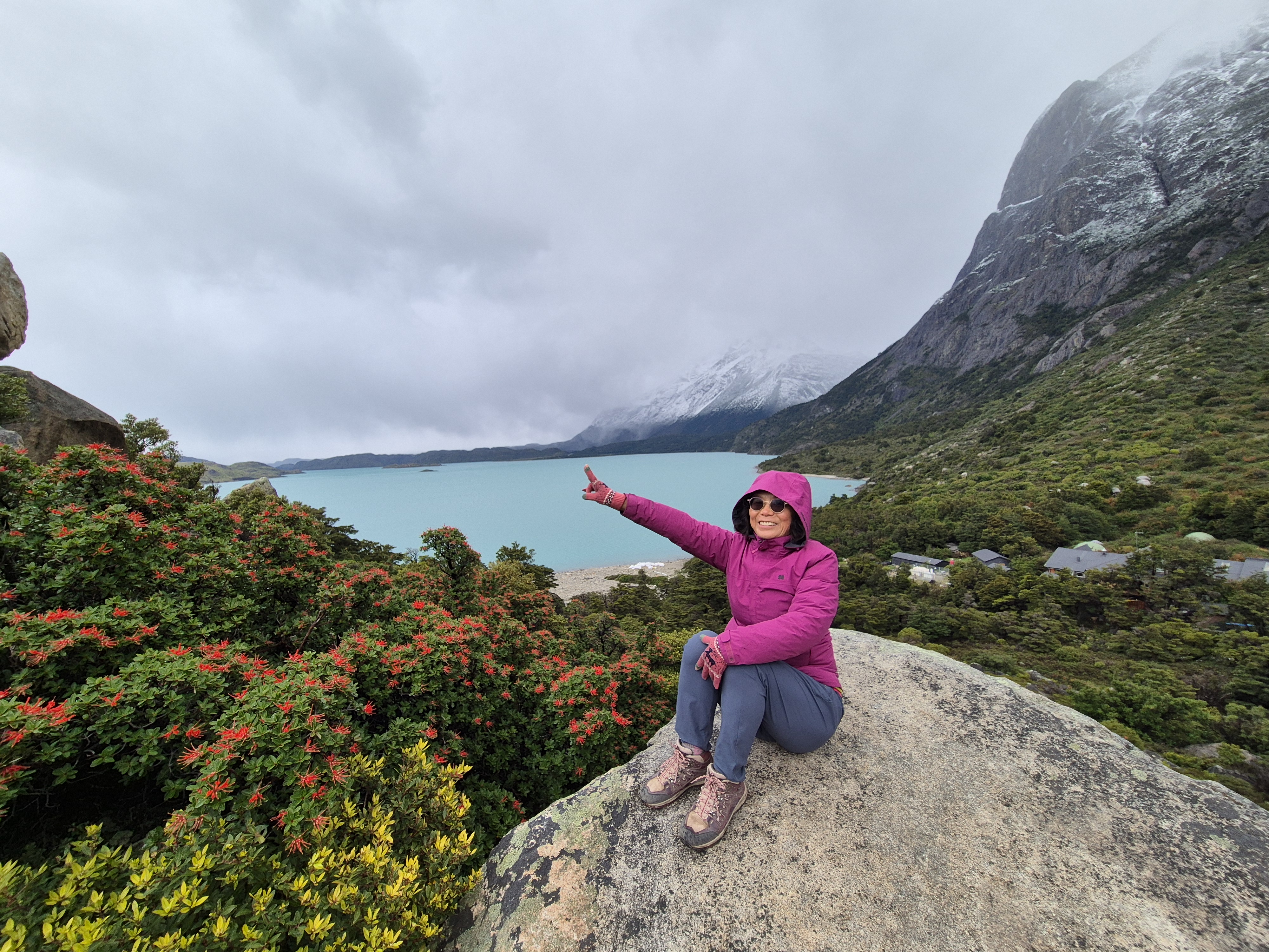 파타고니아 토레스 델 파이네 W-트레킹(3박 4일) 3일차 센트랄 캠핑장 가는 날 어제 밤부터 내린 비는 아침이 되어도 계속 내렸다. 산 위에는 하얀눈세상이 되었다. 쿠에르노스 산장에서 아침을 먹고 비가 그치기를 기다렸으나 체크아웃 시간인 9시 30분이 지나도 계속 비가 내려 빗 속을 출발했다. 빗줄기는 더 굵어지고 진눈깨비로 변해 추웠다. 오늘은 거리가 짧아 여유있게 걸었다. 내리는 눈 속에서도 경치는 좋았다. 2시가 다 되어 오늘의 숙소인 센트로에 도착했다. 눈이 내려 그런지 잘 때 침낭은 따뜻했으나 얼굴은 시러웠다. 불타는 토레스삼봉을 볼려면 칠레노산장에 숙박해야하는데 아쉽게 예약을 못하여 센트랄캠핑장에 가야했다.