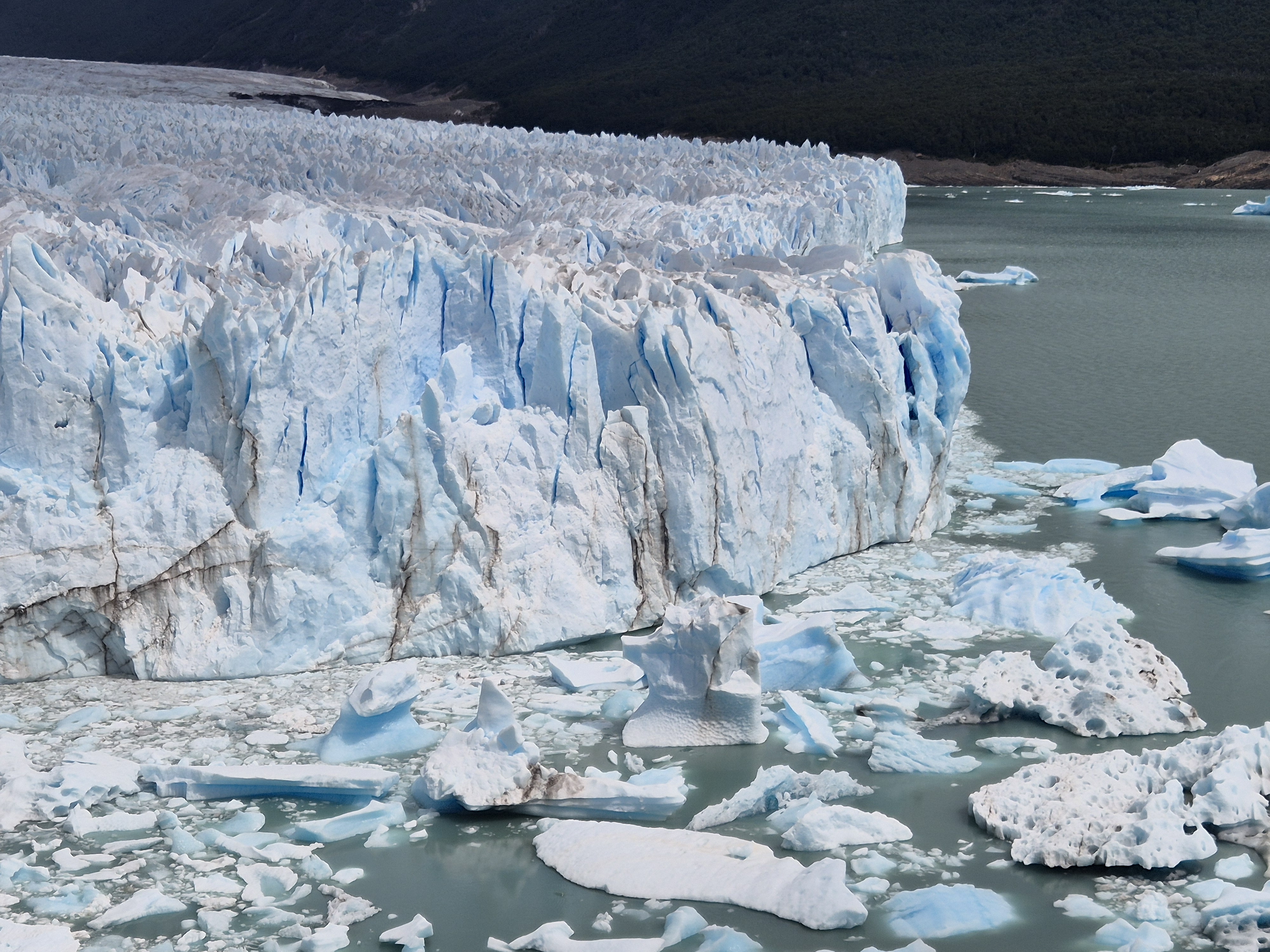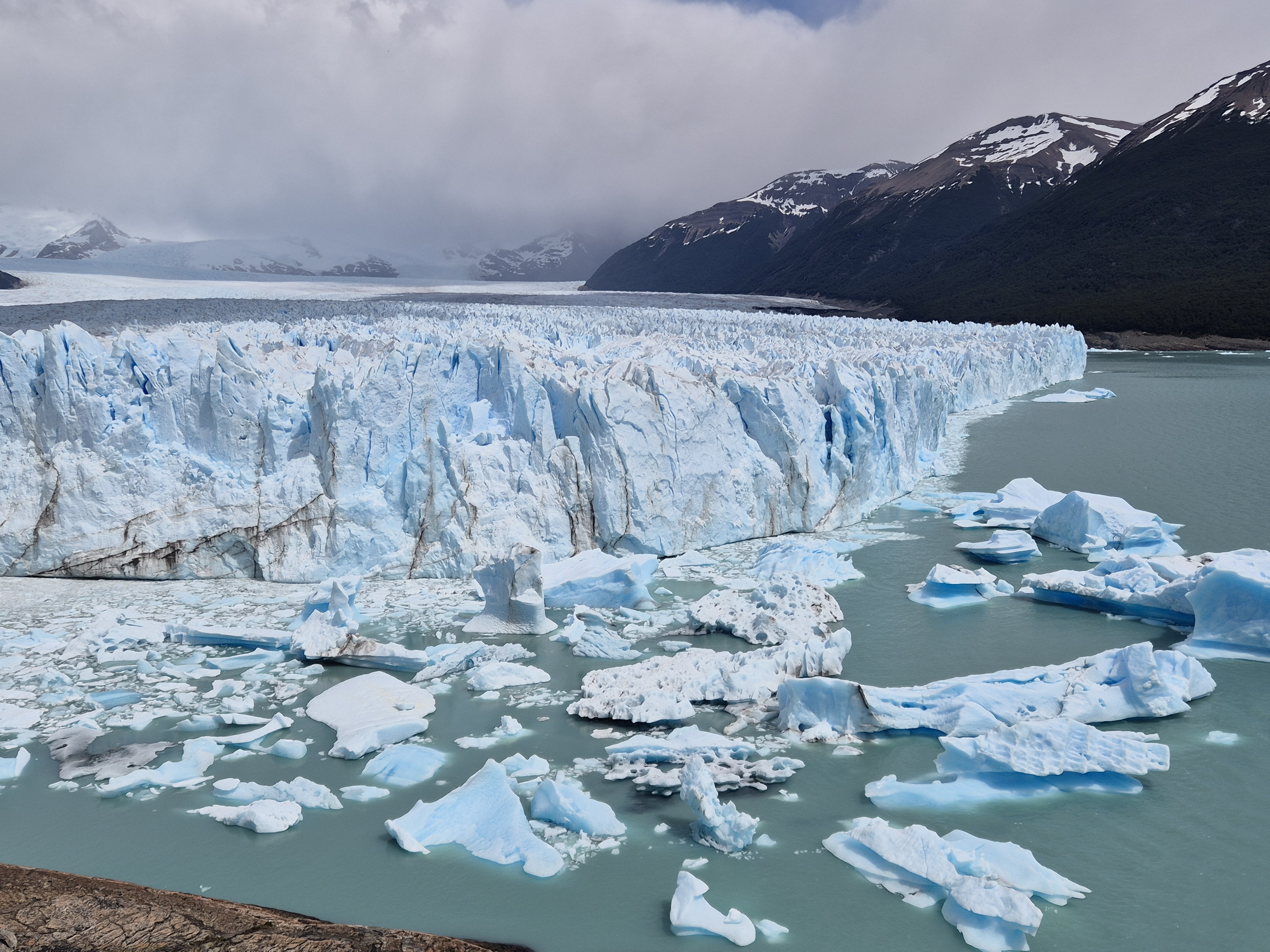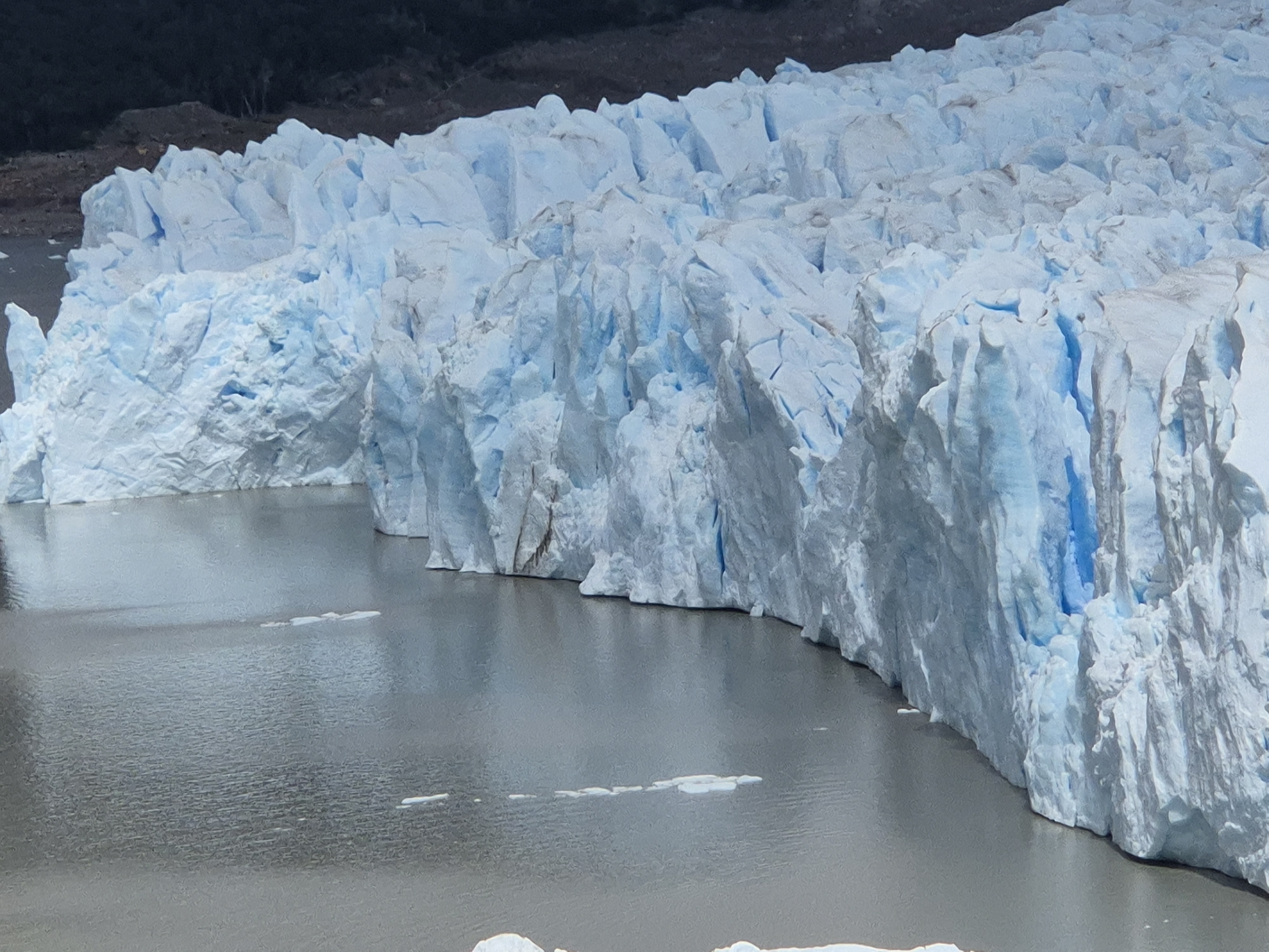 파타고니아 엘 칼라파테 페리토 모레노 빙하를 버스 터미널에서 버스를 타고 직접 찾아 갔다. 어제 터미널에서 현금으로 40,000페소(카드는 45,000페소) 주고 버스표를 예매했다. 아침 8시 30분 하여 출발하여 10시 30분에 빙하에 도착하고 오후 2시 30분에 출발하여 돌아온다고 했다. 페리토 모레노 빙하에서 4시간의 시간이 주어지는데 빙하를 둘러 보기에는 시간이 충분했다. 데크로 길도 잘 만들어놓았고 빙하가 잘 보이는 곳에 전망대를 만들어 놓아 빙하를 보기 좋았다. 생각보다 가까이에서 빙하를 잘 볼 수 있었고, 위에서 빙하 전체를 볼 수 있어 좋았다. 빙하 위쪽은 구름이 끼어있어 약간 아쉬웠지만 빙하를 보기에는 부족함이 없었다. 대포소리를 내면서 떨어지는 빙하도 볼 수 있어 좋고, 작은 조각이 떨어져도 소리는 천둥치는 소리가 났다. 빙하의 거대함을 느낄 수 있었다.