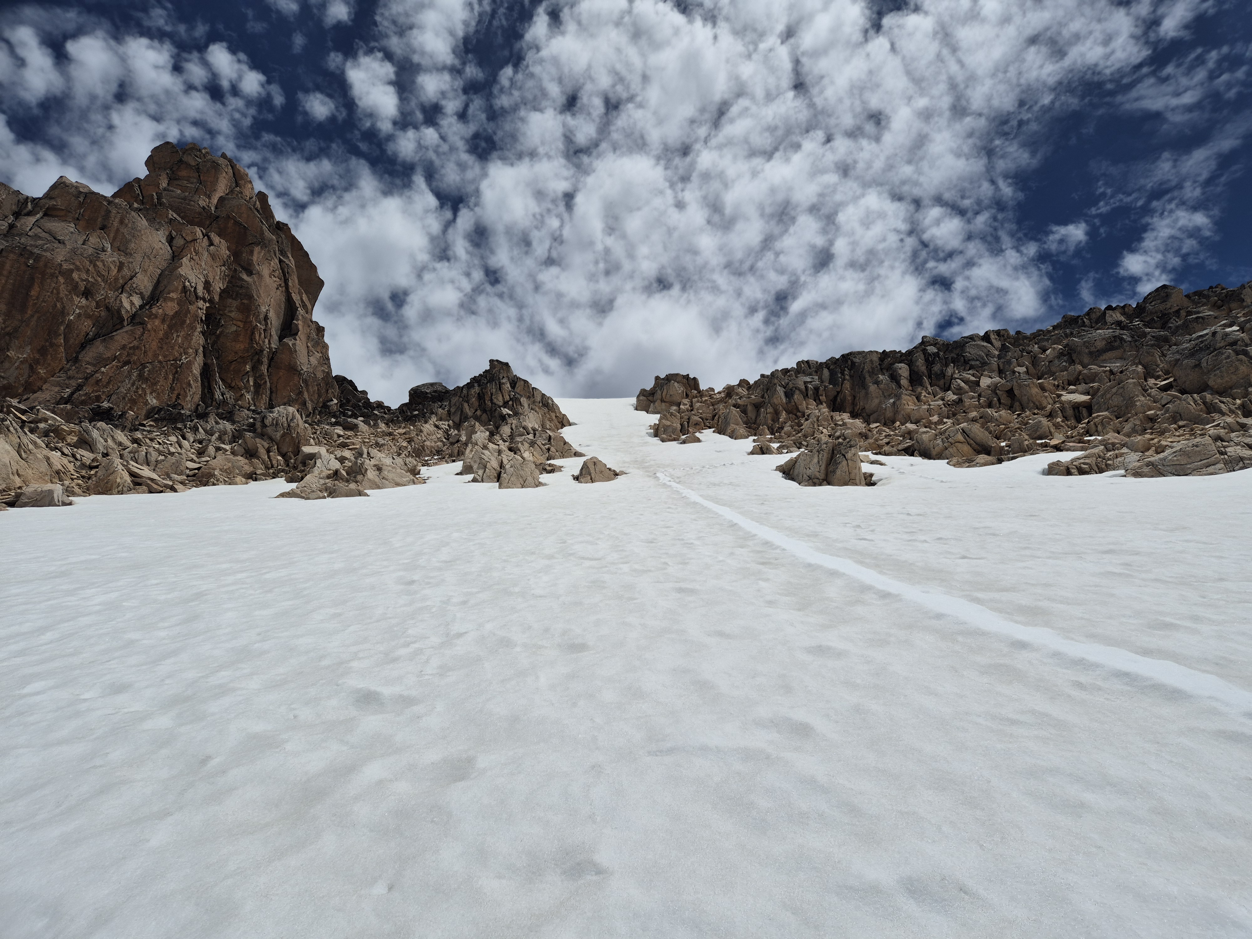 아주 심한 경사진 눈길을 내려가야 한다