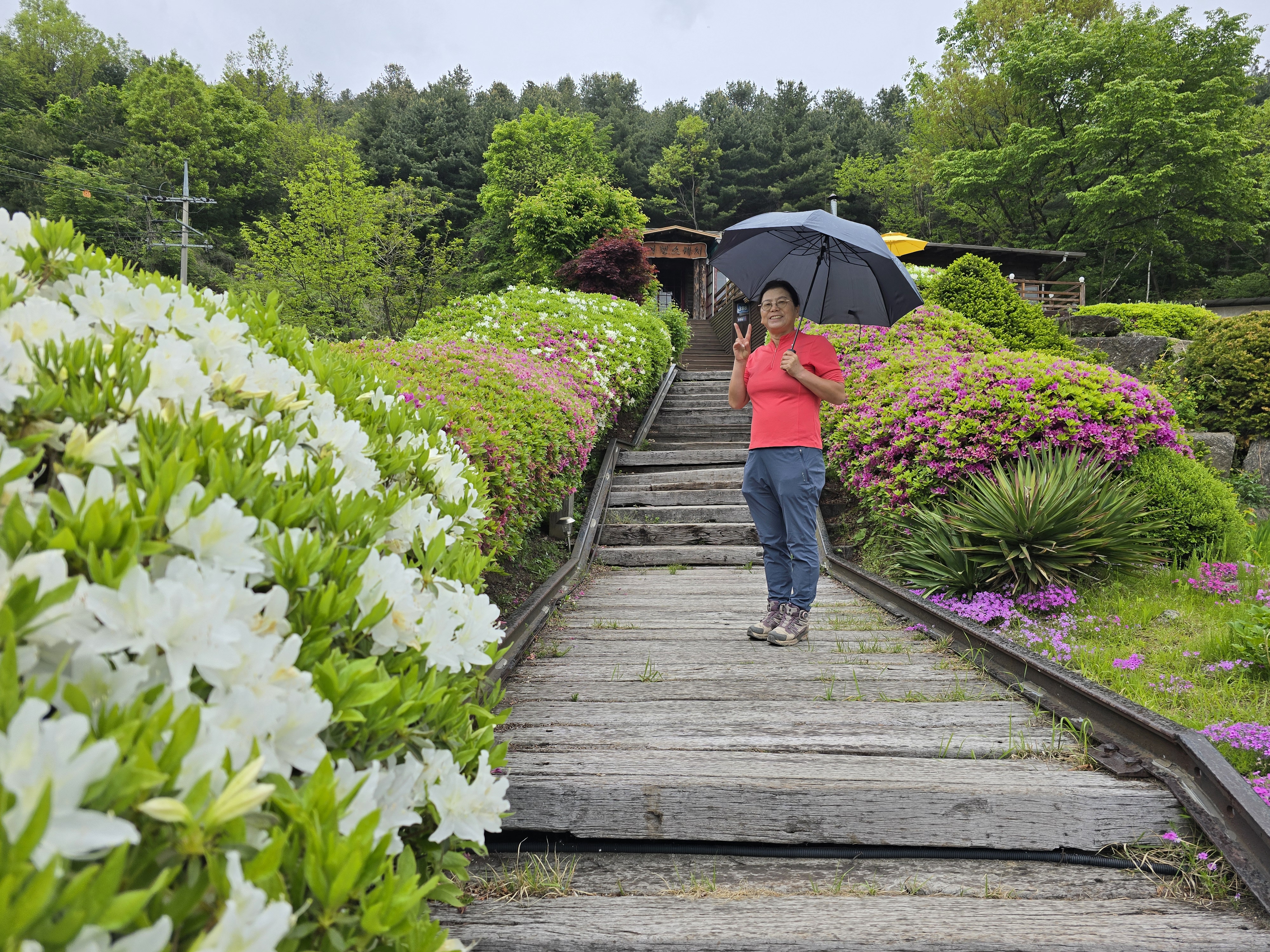블랙야크 한북정맥을 위해 국립아세안자연휴양림에서 숙박하고 아침에 비가오고 있었다. 멀리까지 왔는데 날씨 때문에 포기할수 없어 우중에 챌봉을 올랐다. 이른아침 챌봉 최단코스 여행스케치카페에 도착하니 영업전이라 주차장 입구에 주차하고 경사가 심한 오르락 길이지만 거리가 짧아 쉽게 다녀왔다.