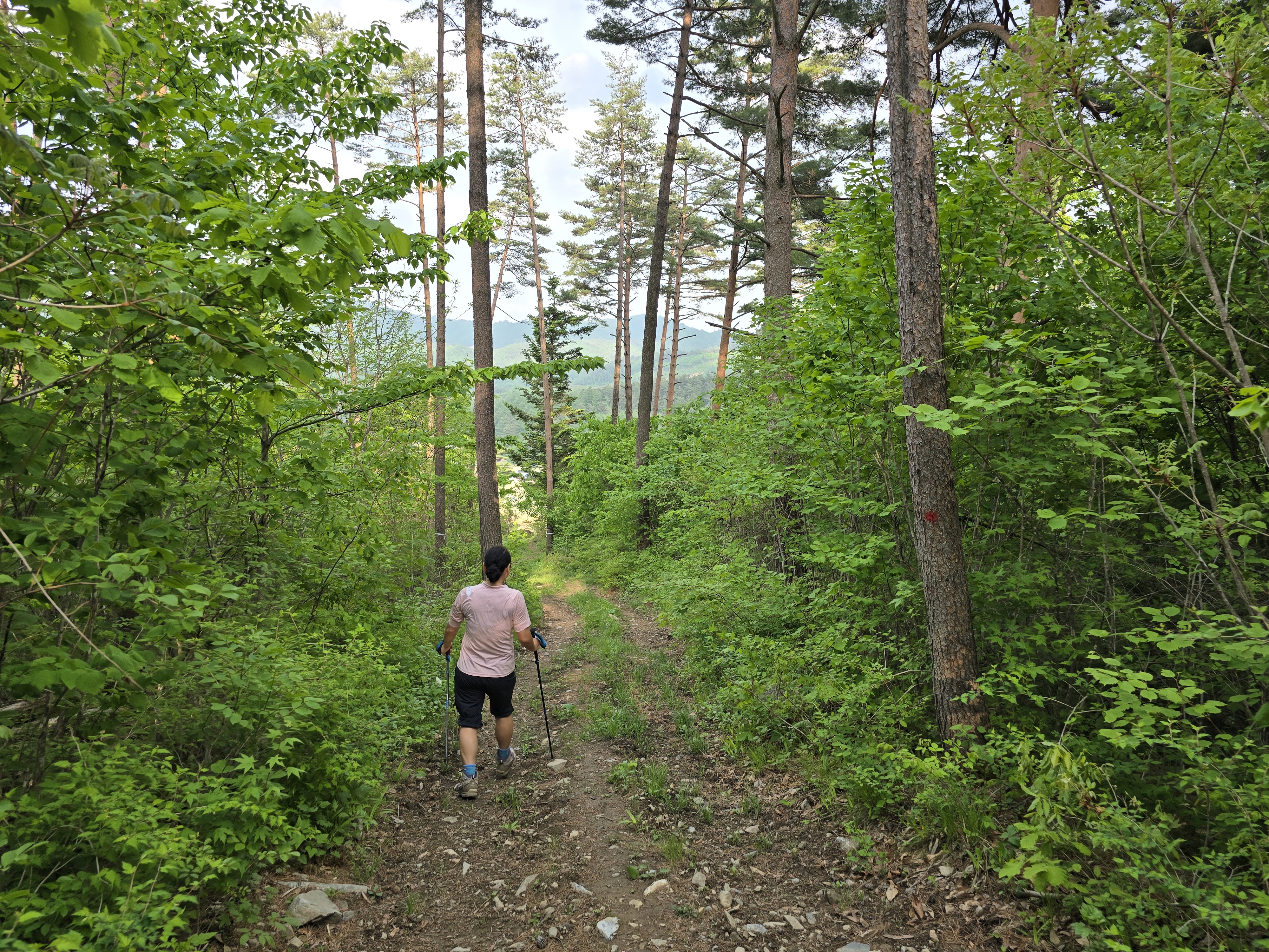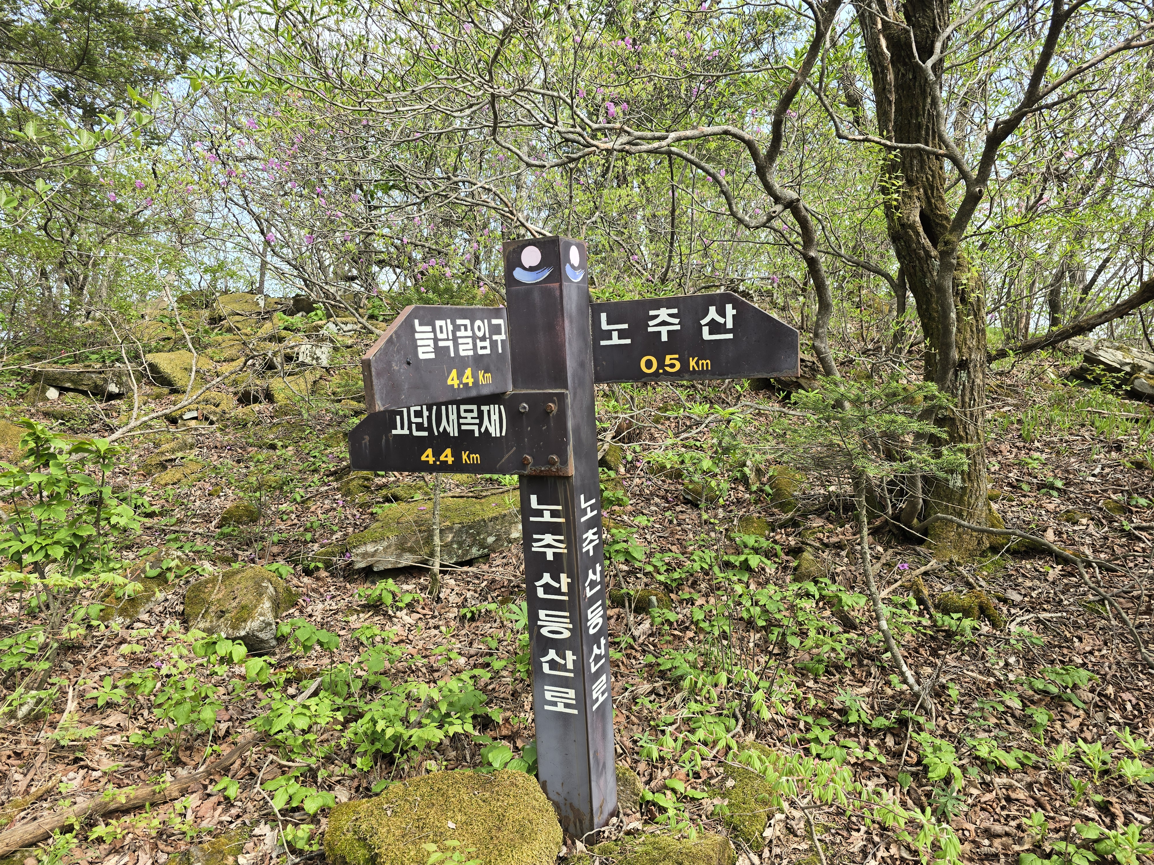 수안보에서 점심을 먹고 노추산 등산을 위해 들머리인 왕산면 대기리 610으로 내비를 찍고 왔다. 꼬불꼬불 강원도 산길을 따라 산촌을 구경하면서 열심히 달려 오후 3시에 노추산입구에했다. 등산로 입구처럼 보이지 않는 곳에 등산로 안내판이 있어 주차를 하고 산행을 시작했다. 입구는 허술했으나 길을 따라 가니 임도가 나오고 안내판도 나왔다. 임도에서 400m 올라가니 노추산 정상가는 안내가 나와고 평탄한 오르막 길이 이어졌다. 5월의 신록은 그 자체로 빛나고 있었다. 중간쯤 오르니 연분홍 철쭉도 피어있고 5월의 강원도 육산의 평안한 등산로에 군락으로 자라고 있는 얼레지 길을 따라 부지런히 올라갔다. 신록에 취해 가다 보니 어느덧 정상. 인증을 하고 여유로운 걸음으로 내려오니 해가 아직도 많이 남아있었다. 돌아 가는 길에 봄을 준비하고 있는 안반데기를 구경하고 다음에 갈 백암산을 향해 가다 진부에서 하루를 잤다.