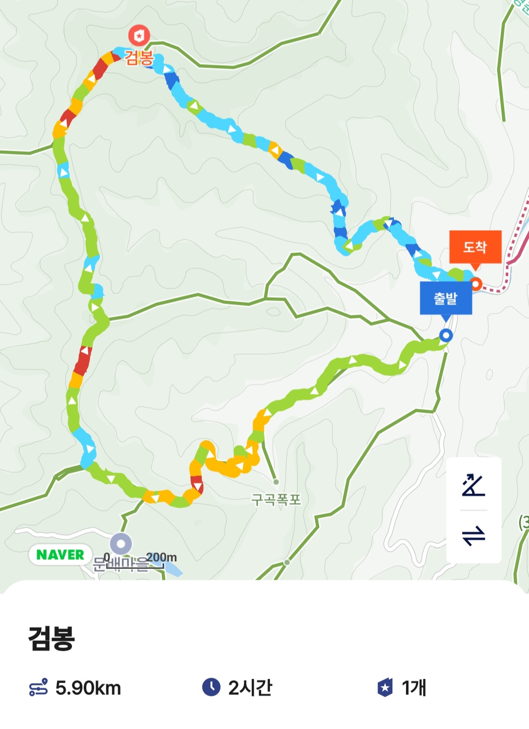 블랙야크 100+ 인증을 위해 춘천 검봉산 최단코스인 구곡폭포 주차장에 주차를 하고 구곡폭포방향으로 올라갔다. 아무리 찾아봐도 정상으로 바로 오르는 길은 보이지 않고 문배마을로 가는 길이 보여 문배마을 길로 올라갔다. 마을로 가는 길은 야자매트를 깔아놓아 편한 길처럼 보이나 경사가 심했다. 문배마을에 점심을 먹으러 가는 사람들도 많았다. 문배마을에서 정상가는 길이 능선길은 걷기 편했다. 정상에 올라가니 주차장으로 가는 길 안내가 있어 주차장으로 곧장 내려왔다. 검봉산 최단코스는 구곡폭포 입장권을 구입할 필요없이 주차장입구에서 정상으로 올라가는 길이 있었다. 구곡폭포를 가는 길이 좋으니 구경하고 가는 것도 좋은것 같다. 전망은 없지만 구곡폭포와 문배마을을 품고 있는 멋진 산이었다.
