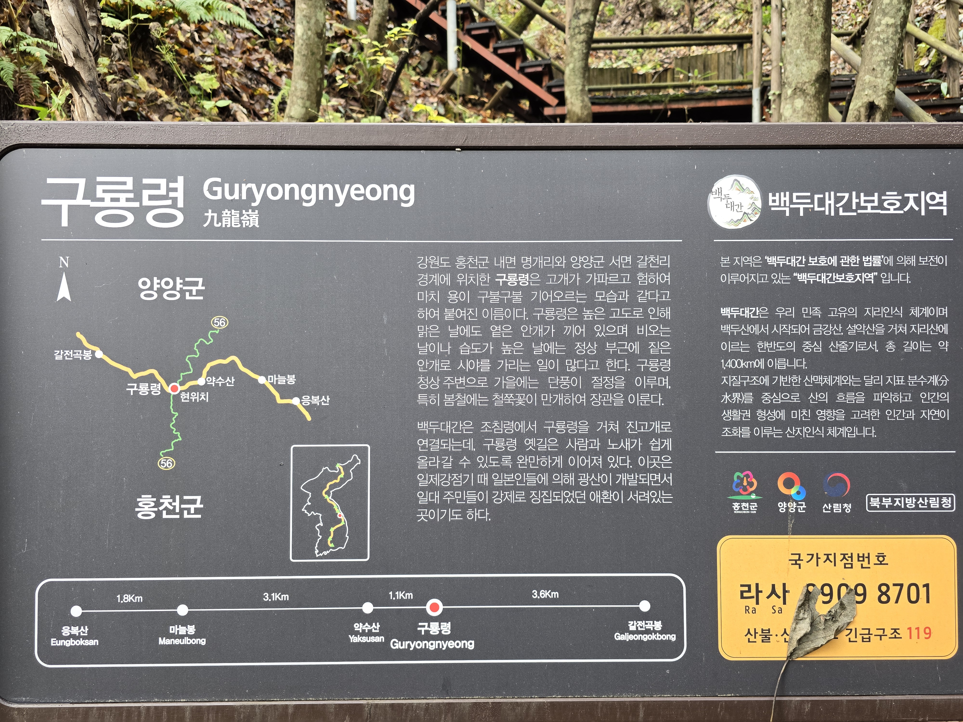 백두대간 갈전곡봉 가는 길은 동물이동통로에서 100m 아래쪽에 계단길이 있다.