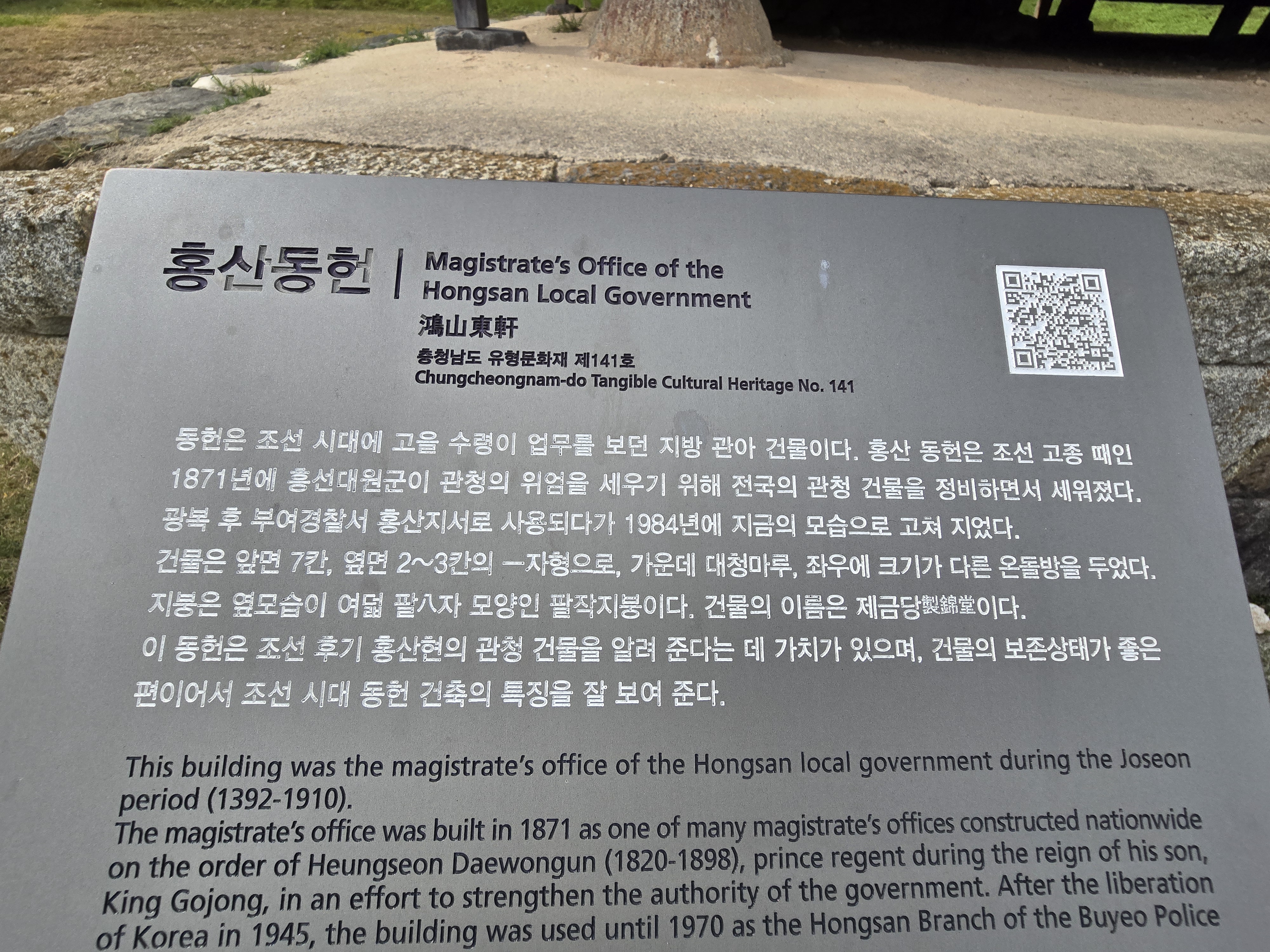 역사문화대장정 인증을 위하여 부여 홍산관아를 찾았다. 관아 앞에 공사를 하고 있어 조심조심 관아를 구경했다. 복원해놓은 것이 눈에 다 보이나 조선시대의 관아의 모습을 상상할 수 있는 유적지였다. 그 많던 관아는 어디로 다 사라졌을까? 이렇게 나마 복원된 모습을 상상할 수 있어 뜻깊은 유적지였다. 근처에 홍산전통시장이 있었으나 2,7일이 장날이라 아쉬웠다.
