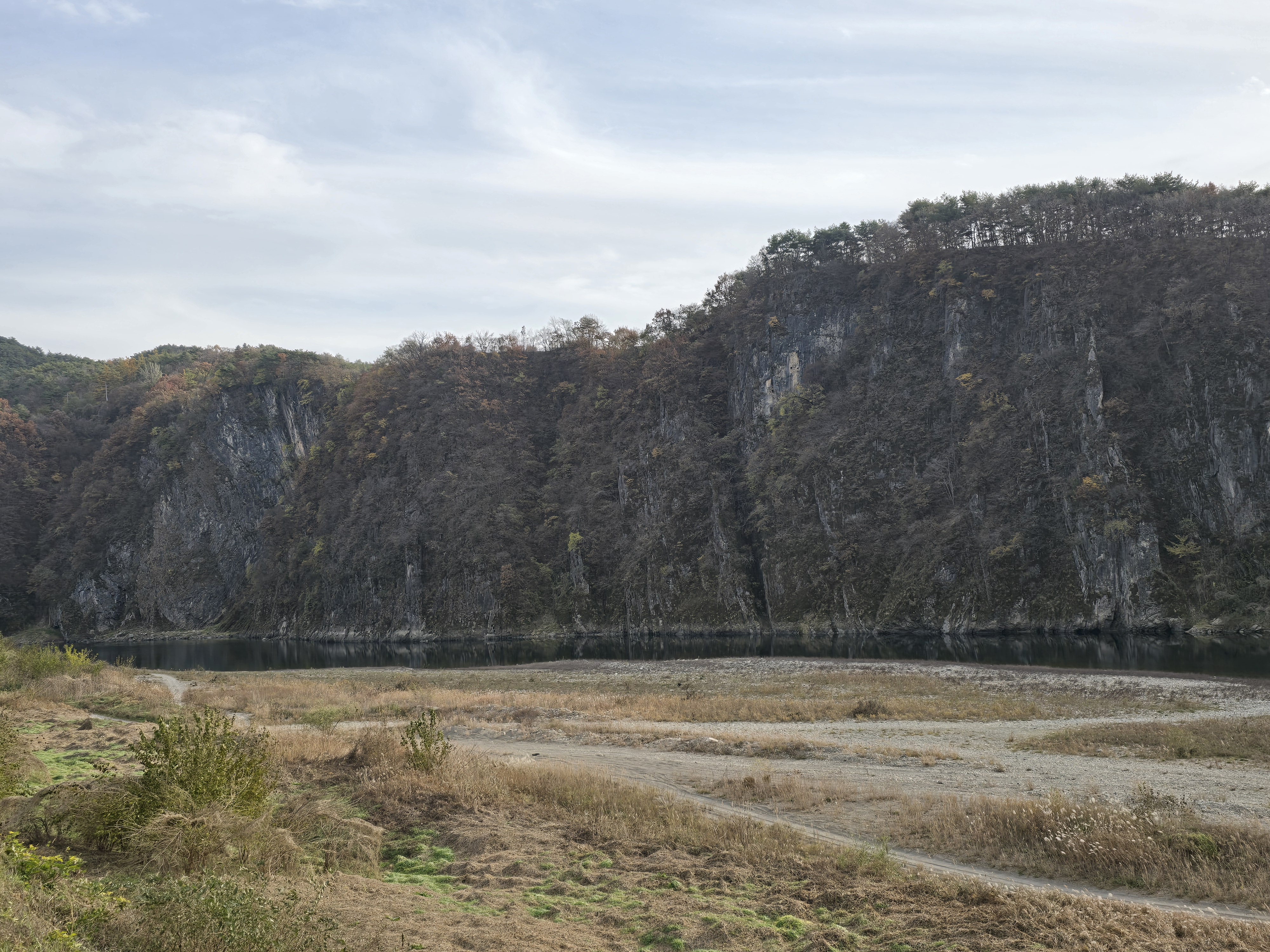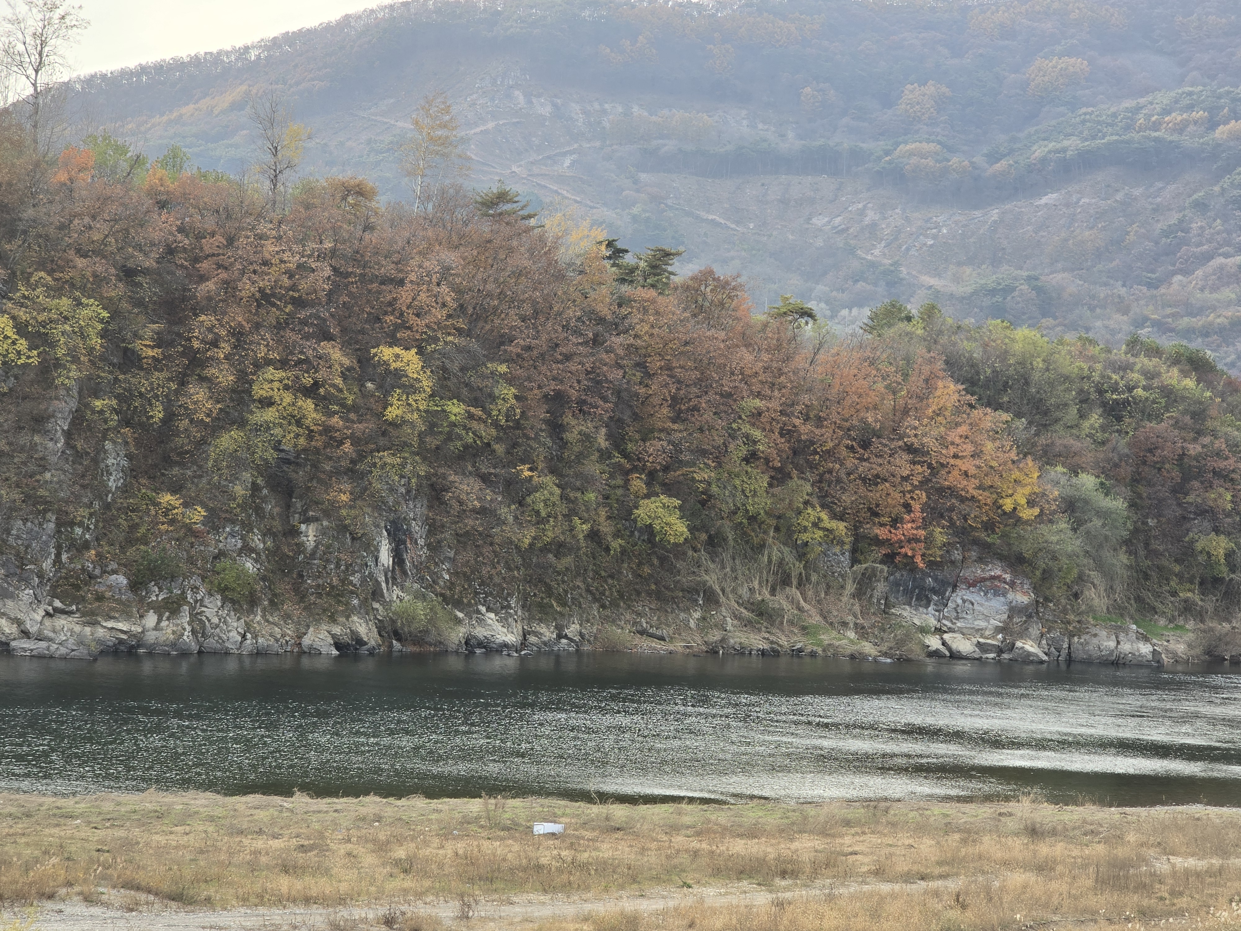 온달산성과 구인사에 가까운 거리에 있는 영춘북벽을 찾았다. 영춘북벽은 강변에 깎아 지른 듯한 절벽이 병풍처럼 400m 이어진 기암 절벽이이다. 지금까지 단양 남한강 길을 달려오면서 많이 본 바위 절벽과 비슷하다. 자연의 힘과 원리란 언제 보아도 위대하다. 유네스코 세계지질공원 석회암과 바위절벽. 강변에 주차를 하고 정자에 올라 절벽을 한참동안 바라보다 돌아왔다. 근거리에 있는 구인사 단풍을 구경하고 단풍으로 유명한 보발재를 넘었다. 역시 명불허전. 붉게 물든 단풍들의 사열을 받으며 꼬불꼬불 길을 올라갔다. 절정은 보발재 전망대에서 내려다보는 단풍이다. 자연에 인간의 생각을 조금만 보태면 이런 멋진 풍광을 연출할 수 있는 것이다.