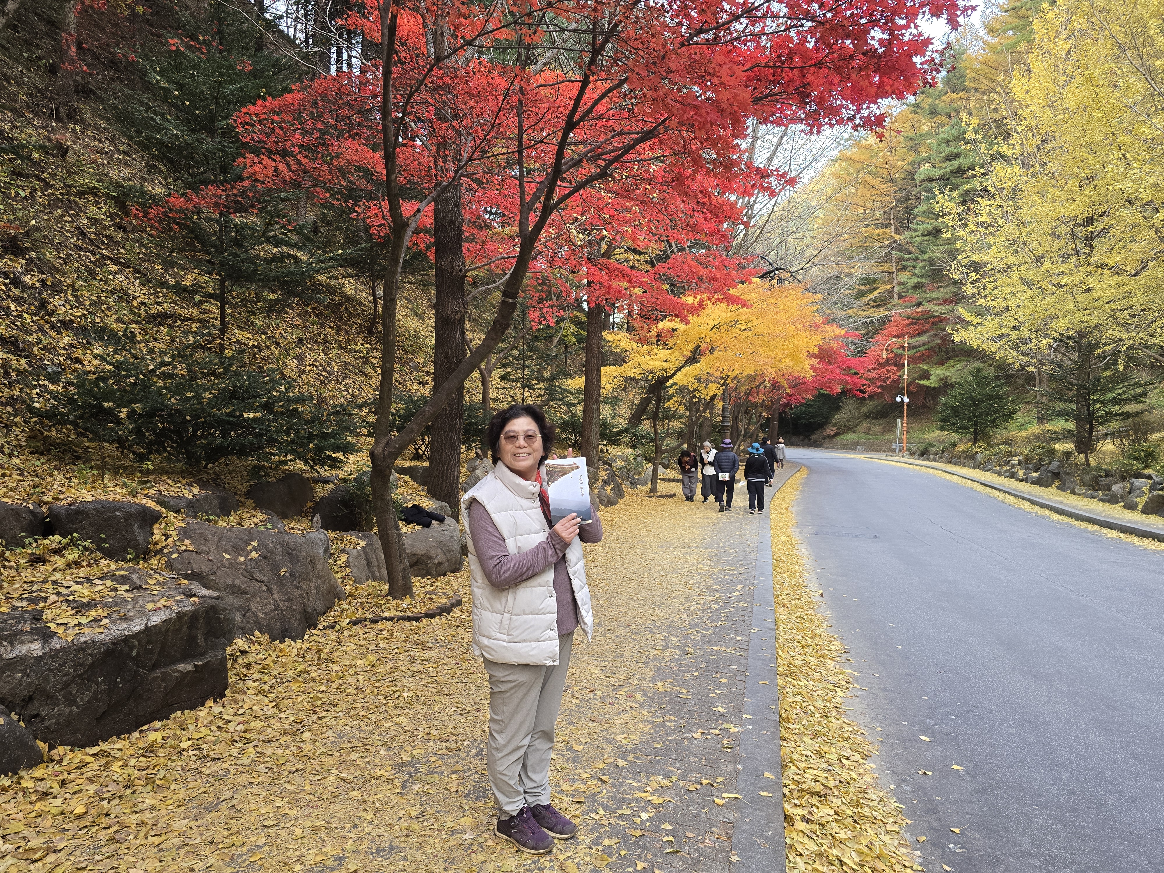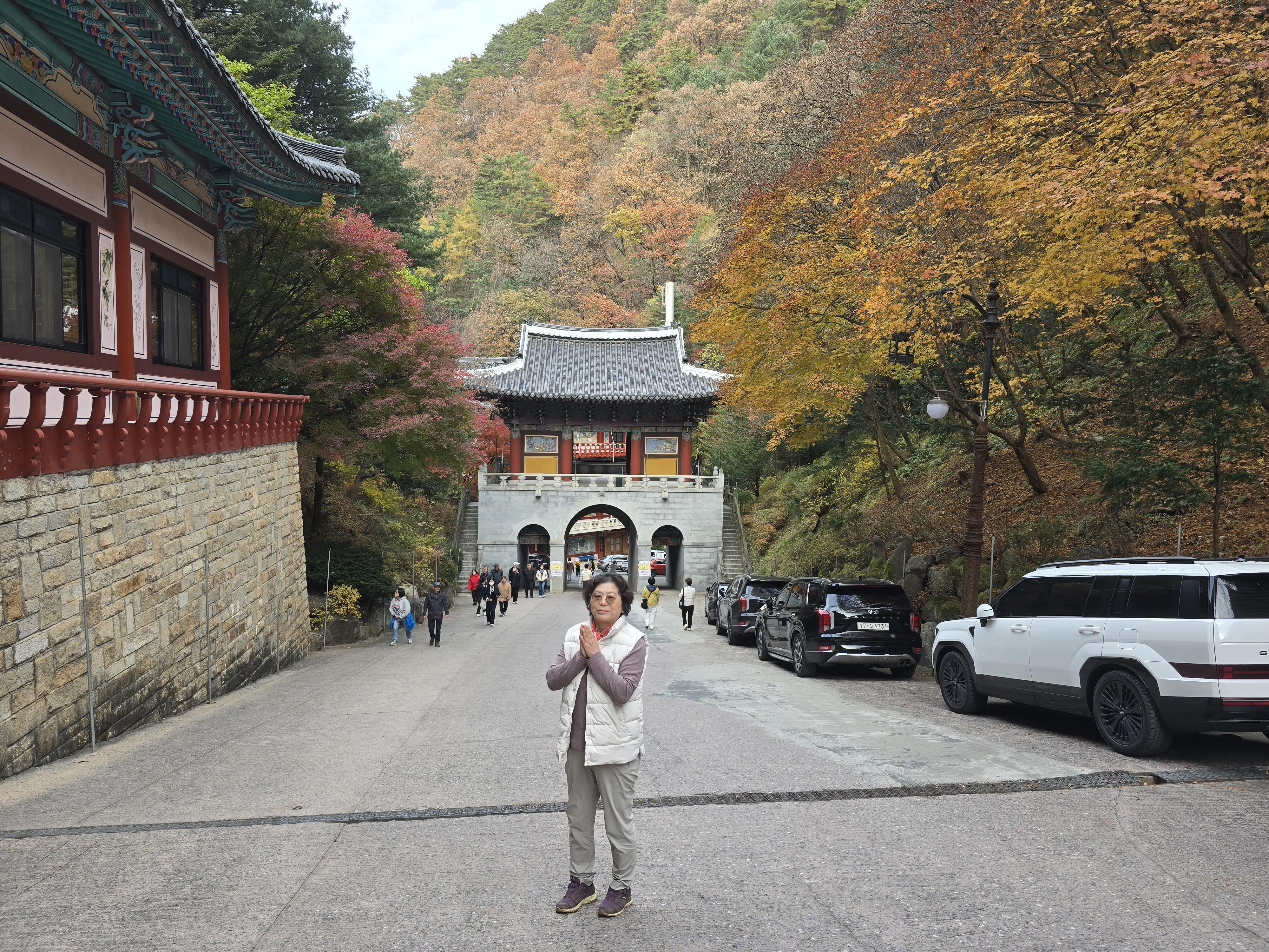 단양의 문화역사를 구경하고 오늘의 숙소인 영주산림치유원에 가기 전에 단풍이 예쁘다는 구인사에 들렀다. 주차장에 주차를 하고 셔틀버스를 타고 구인사 입구에 갔다. 가는 길이 단풍들이 울긋불긋 피어서 정말 장관이었다. 사찰입구에 여러 지역에서 오는 시외버스가 오고 있었다. 일주문을 들어서니 골짜기에 들어선 거대한 구인사의 건물들과 빨간 단풍이 절묘하게 조화를 이루고 있었다. 오르막을 오르는 힘듦도 단풍 구경하느라 잊을 정도였다. 이런 골짜기에 이렇게 거대한 구인사를 지을 생각한다니. 올라올 때 버스에서 본 예쁜 단풍길을 걸어 내려오면서 마음껏 즐겼다. 가을의 구인사는 단풍들의 축제장이었다. 단풍을 찾아 구인사에 왔다면 가까운곳에 있는 보발재 단풍도 구경하면 좋다.