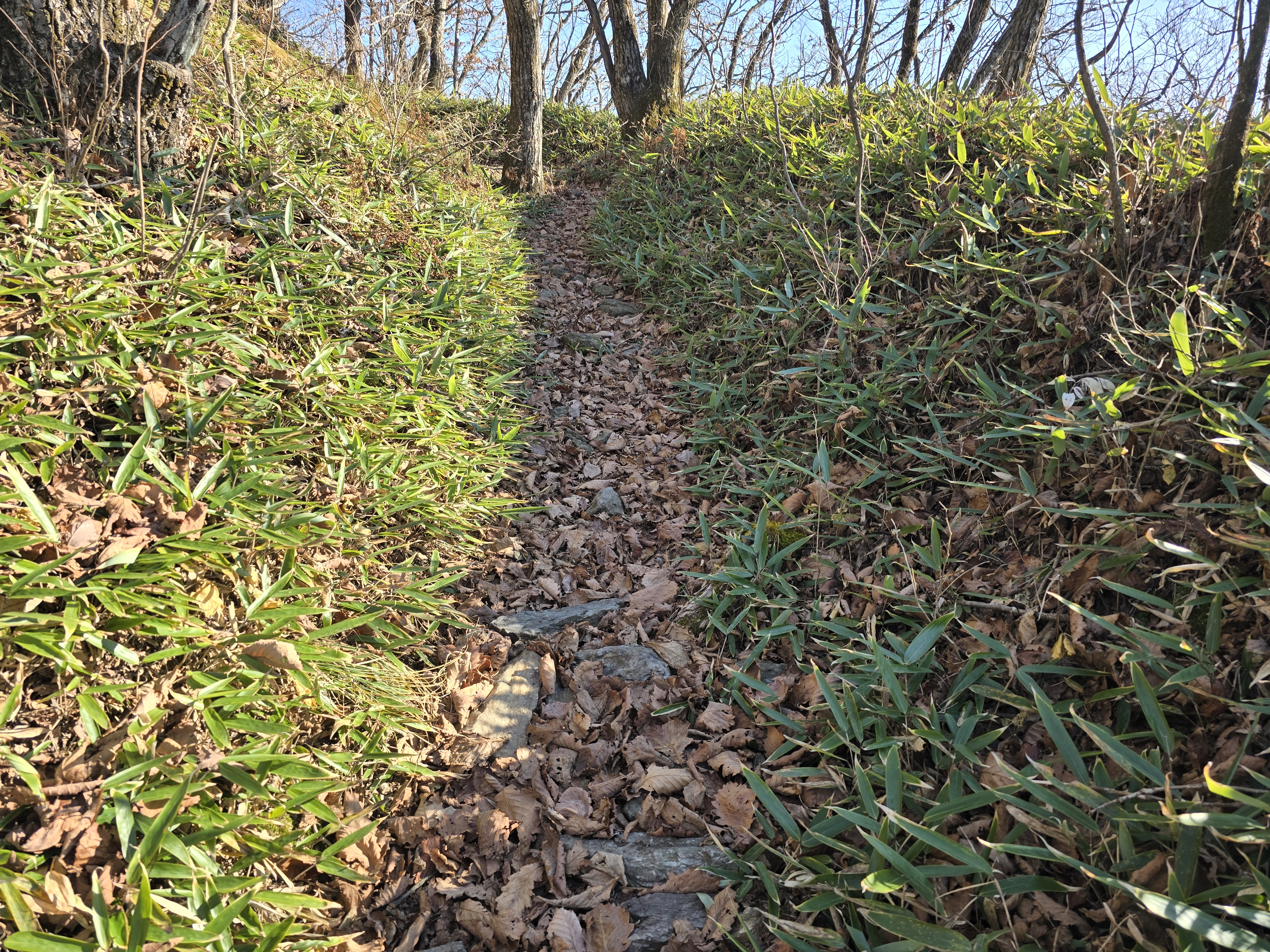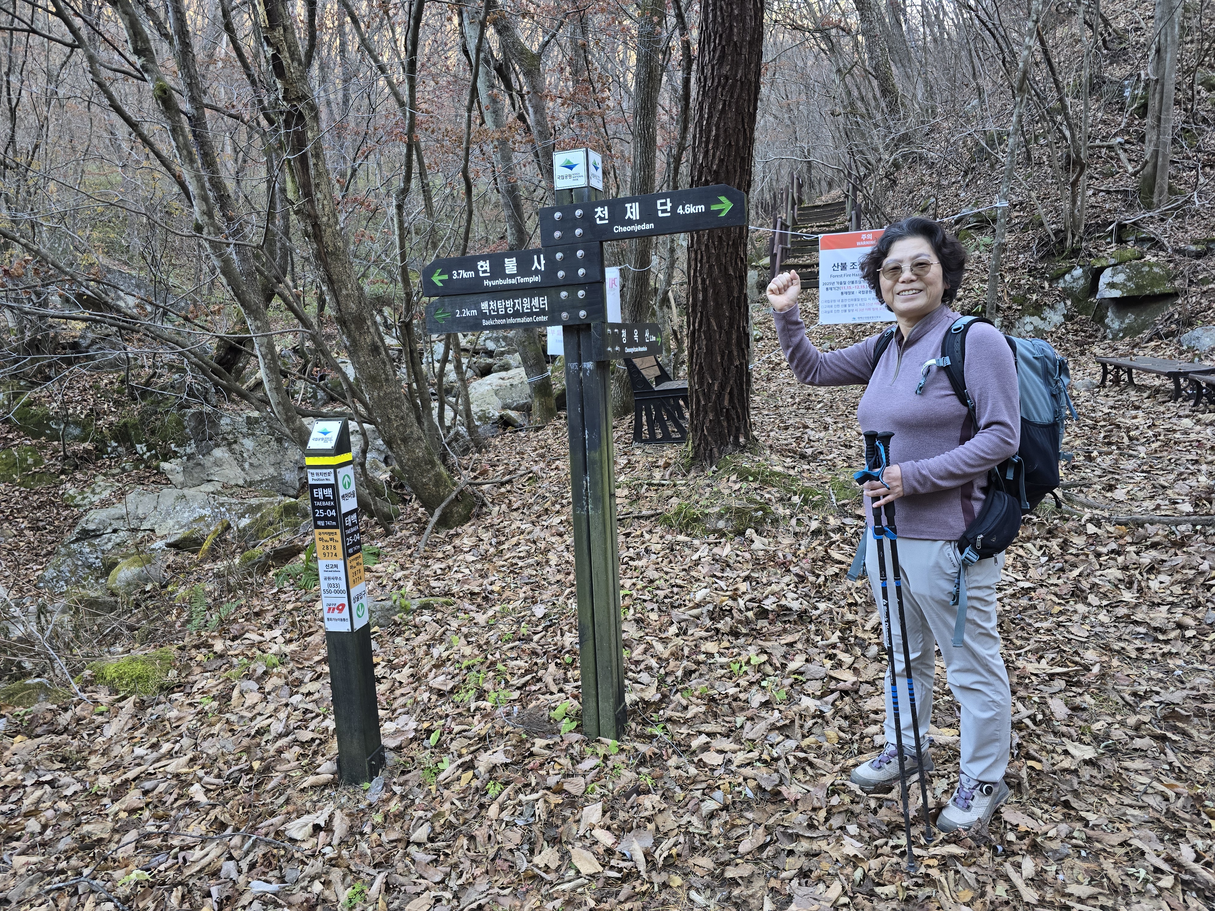 전날 백두대간과 백두대간수목원을 구경하고 춘양에서 숙박하고 이른 아침 기사식당에서 아침을 먹고 빵집에 점심으로 호밀빵을 준비하여 도래기재에서 구룡산 신선봉 깃대배기봉 백천탐방지원센터까지 등산했다. 최단코스를 좋아하는데 신선봉이 중간에 있어 할수없이 오랜만에 장거리 백두대간길을 걸었다. 가을철 산방하루전 평일이라 등산객을 한사람도 만나지 않았지만 등산길이 잘되어 있고 겨을을 맞이하고 있는 대간길엔 낙엽이 수북히 쌓여 하루종일 낙엽밟은 소리를 들어면서 걸었다. 깃대배기봉에서 태백산으로 갈려다 몇일전에 다녀온 산이고 백천계곡길은 초행이라 호기심에 하산했다.